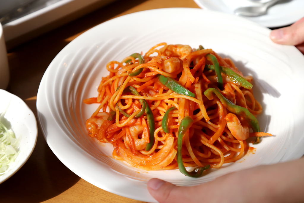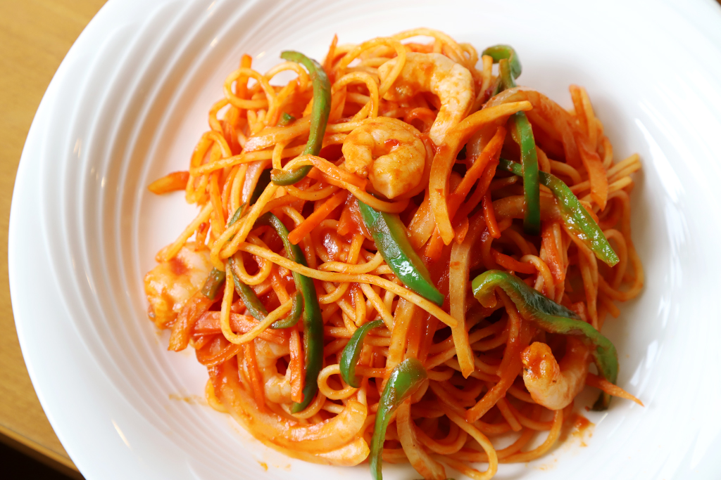 年齢を感じさせないほど機敏にフライパンを振るうオーナー。常に笑顔で真摯に対応してくれるオーナーの雰囲気から、ここに通う人も多いはず。その人柄の良さは、このナポリタンにも伝わる。フライパンを強火で一気に温めたら、ピーマンやにんじんなど、定番の具材を一気に炒め、仕上げに大粒のエビを投入。「ウインナーよりも大っきなエビが入っていたらちょっと嬉しいかなって思って」。そうはにかむオーナーの愛情たっぷりのナポリタンが瞬く間に完成!