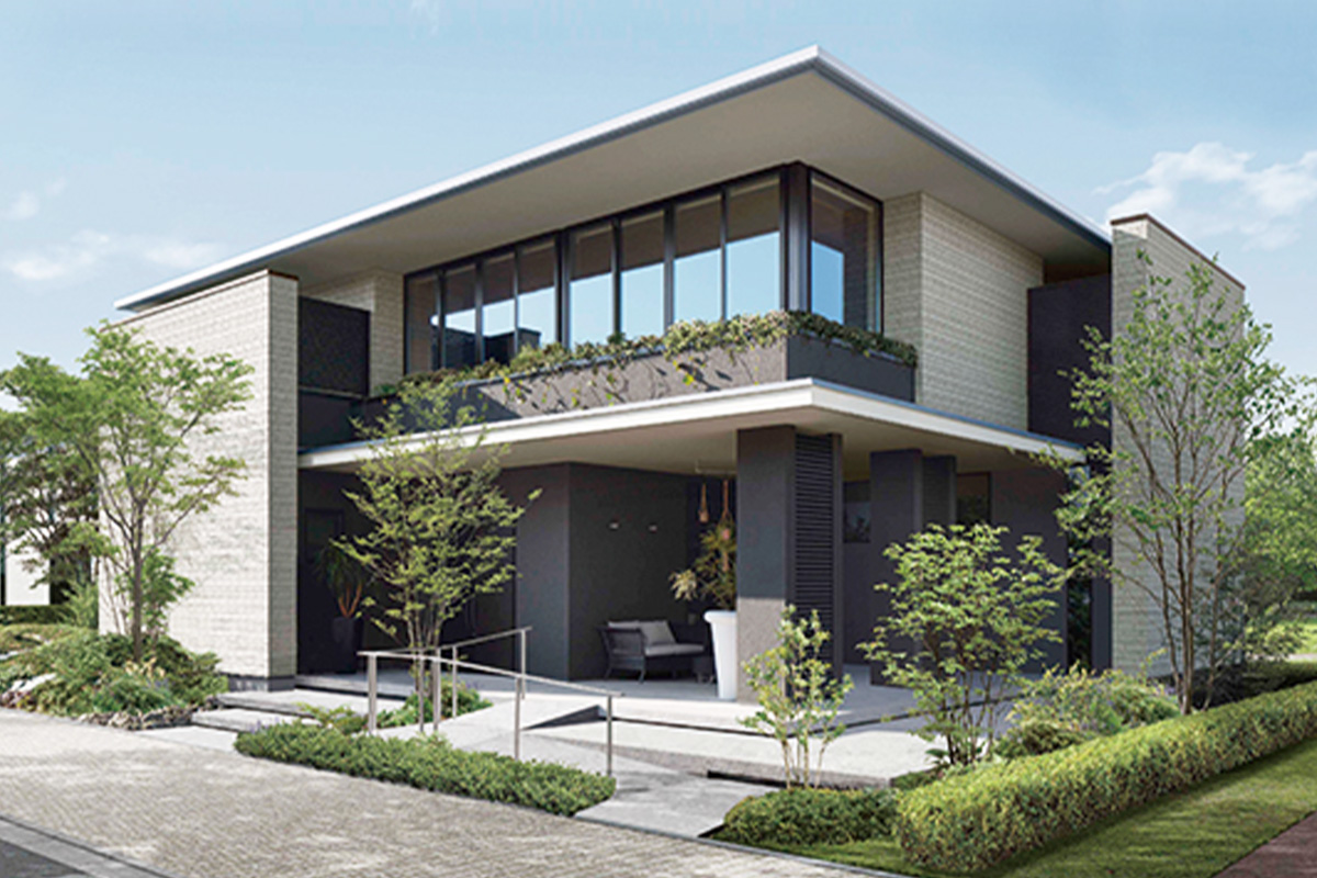 吹付にタイルをあしらったデザイン性が高い外観は、バルコニー高壁がアクセントに。季節に合わせて日差しを調節する深い軒は、夏の日差しを遮り、冬の日差しを取り込むことで、機器のみに頼らない「涼温房」の生活がコンセプト。