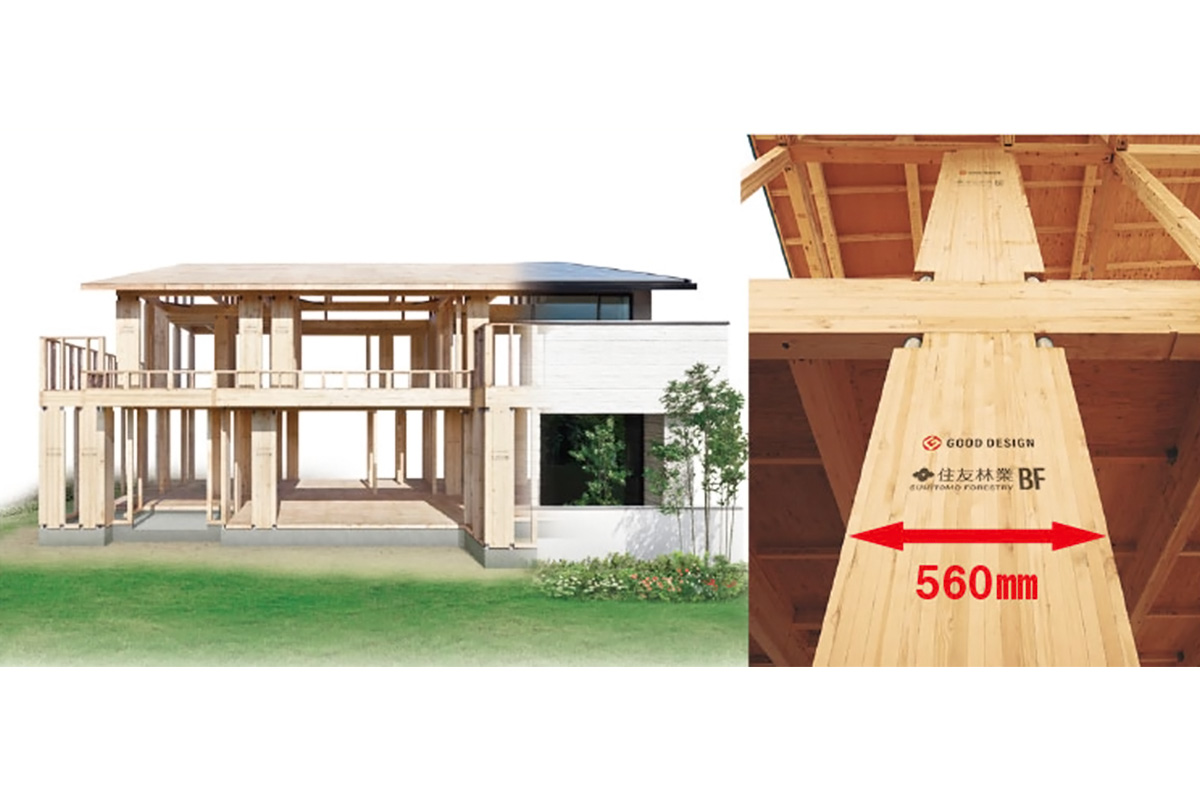 通常の5倍太い幅560mm×105mmの柱「ビックコラム」を使用した、住友林業オリジナルの構法。まるで壁のような柱を使うことで、「観測史上最大級の地震を大きく上回る耐震性」「初期保証30年が裏付ける耐久性」「360°3重に覆った断熱性」「将来の可変性にも対応できる自由度」を実現。