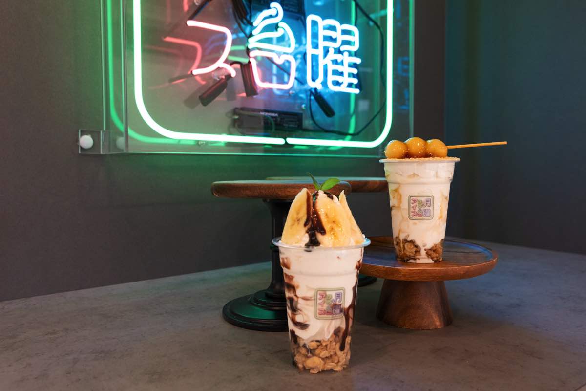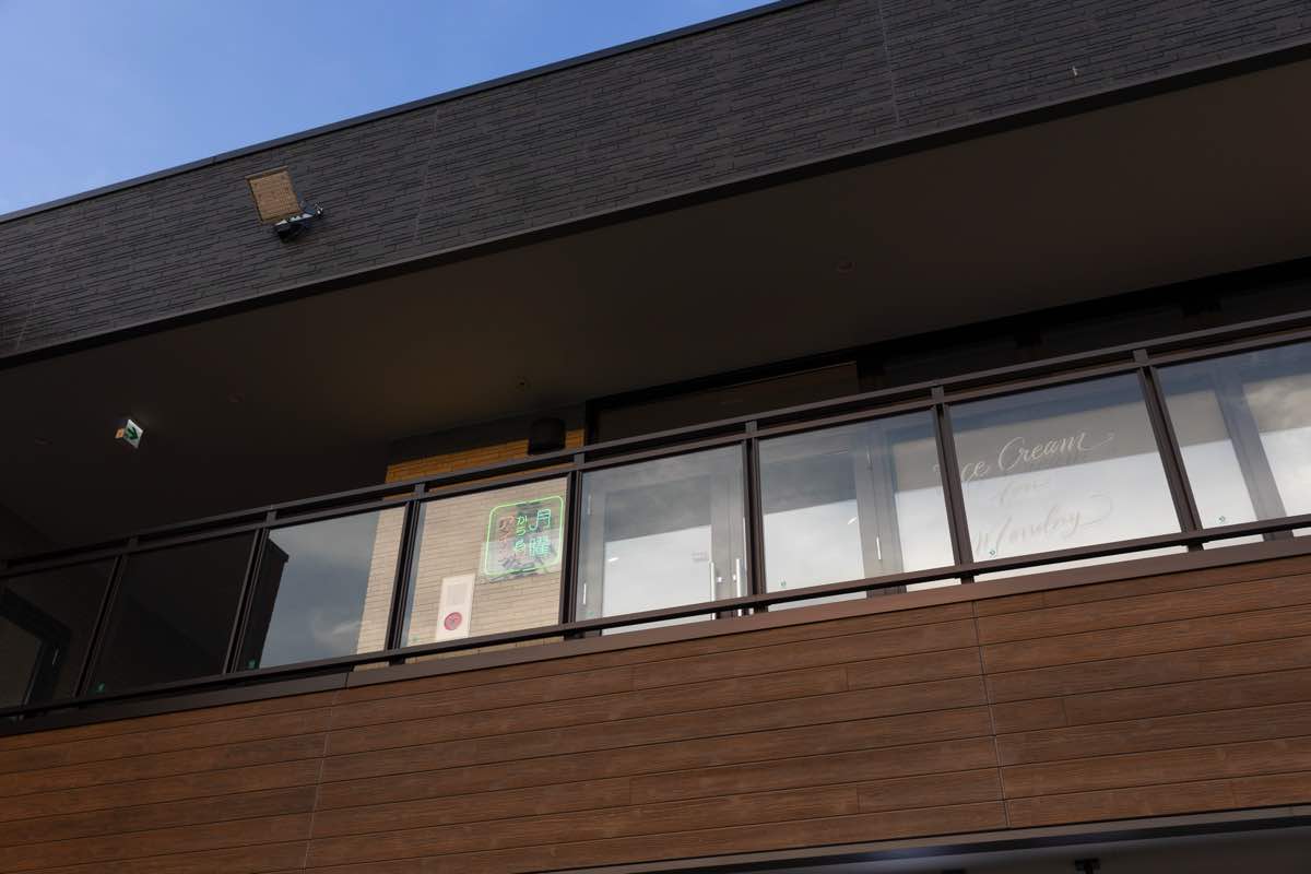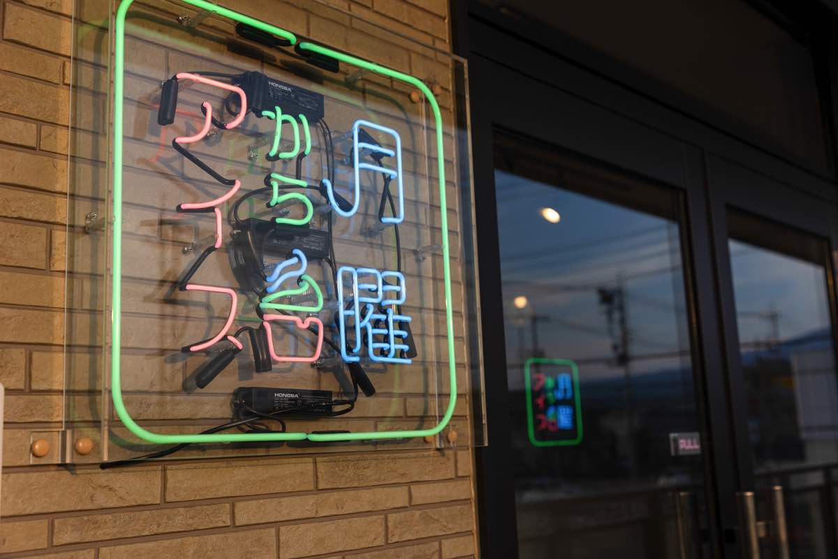 テナントビルの2階にあり、店内はカウンターのみ。ネオンカラーの“月曜からアイス”のロゴが存在感たっぷりに輝く。