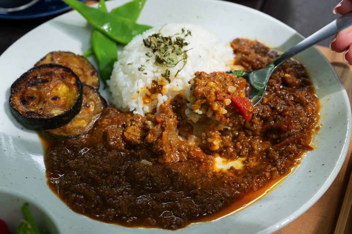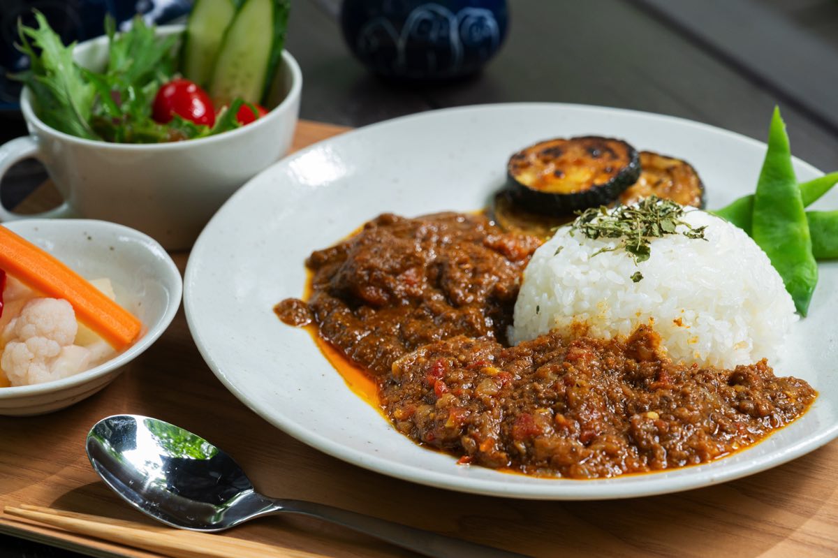 地元の夏野菜や自家製ピクルスといただくこちらのカレーは、牛のスジ肉カレーとキーマカレーの2種盛りが楽しめる。