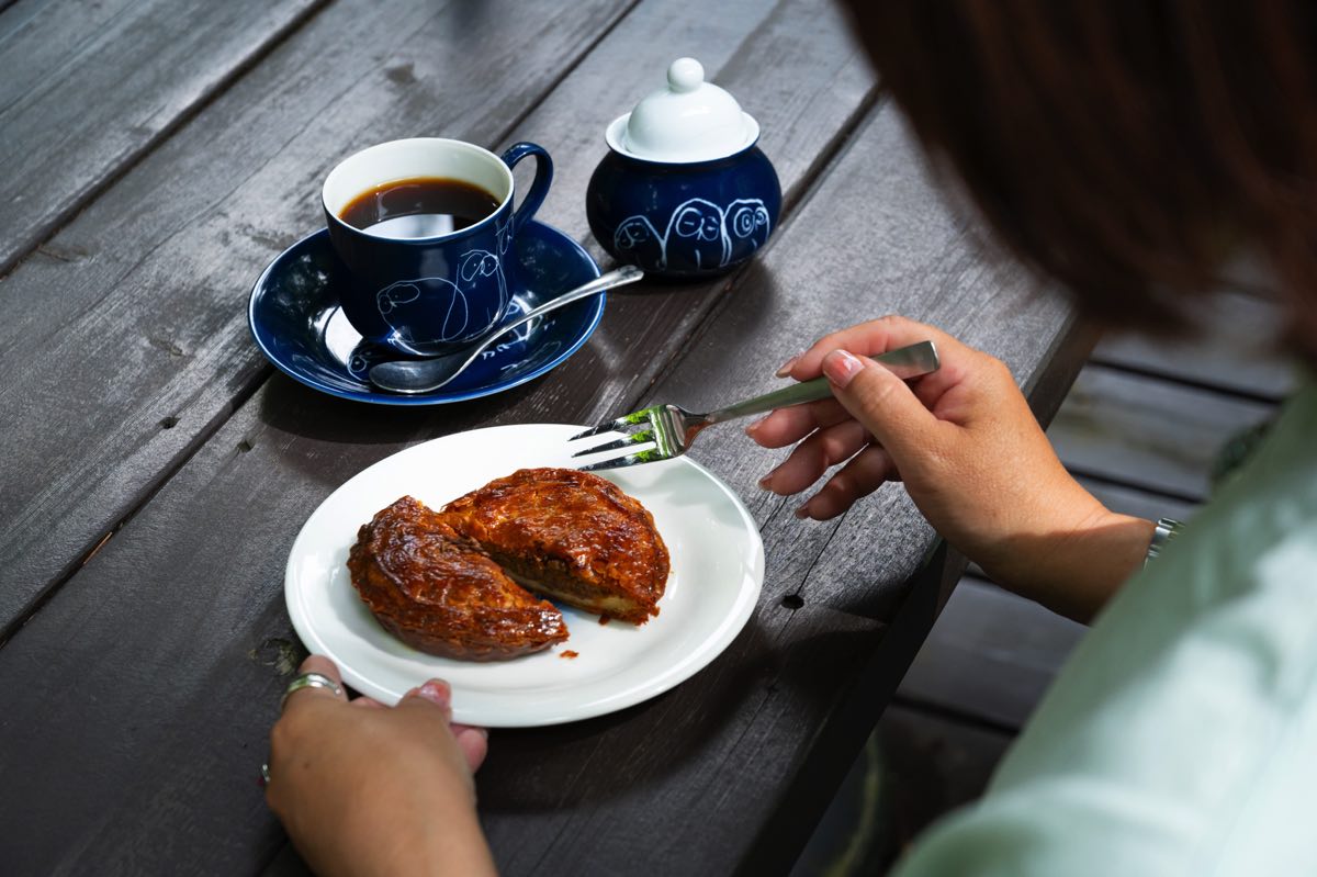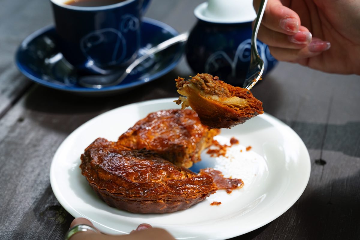 苦みはあるけど、雑味がなくすっきりした印象で、甘くクリアな味わいのコーヒーに、本来ならアップルパイを合わせたいところだけど、本日はキーマカレーパイを選んでみた。