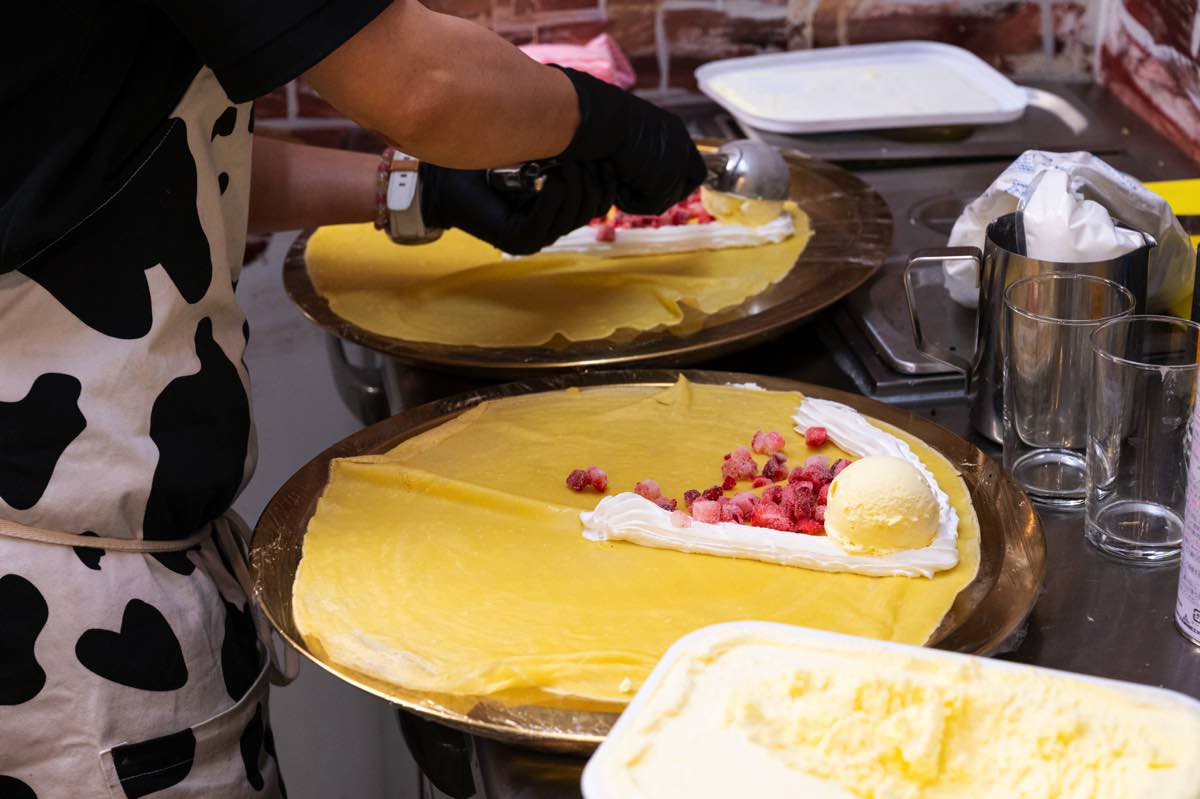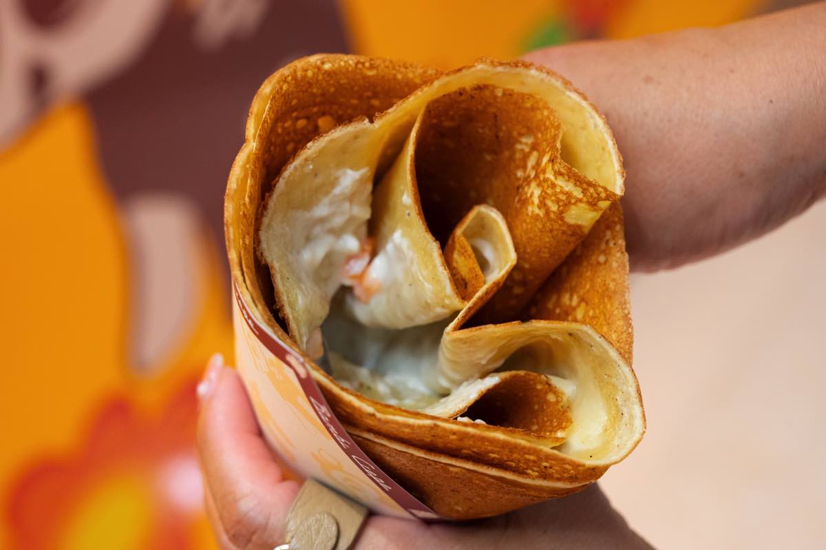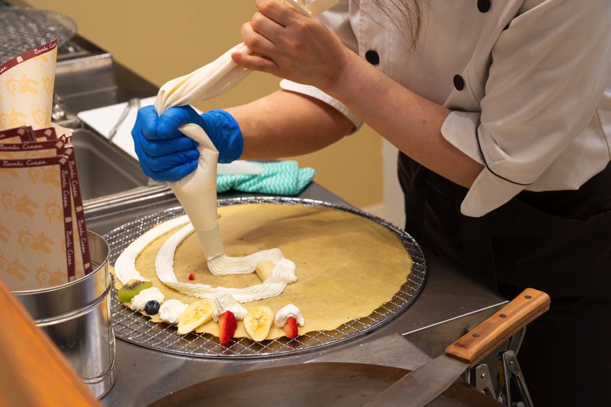 スイーツ系クレープはもちもち食感を際立たせ、キッチンカーではやわらかすぎて使えなかった、添加物ナシの生乳のみからできた純生クリームをたっぷりと使用。