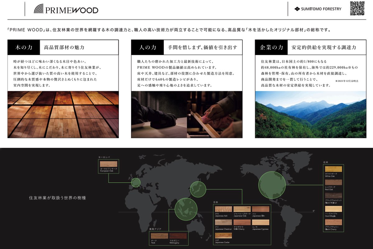 プライムウッドとは、住友林業の高品質な木を活かしたオリジナル部材の総称。厳選された良質な木を、経験豊富な職人の手と最新技術で正確かつ均一に加工。年月とともに味わいが深まり、品質の良さが一層際立つ。