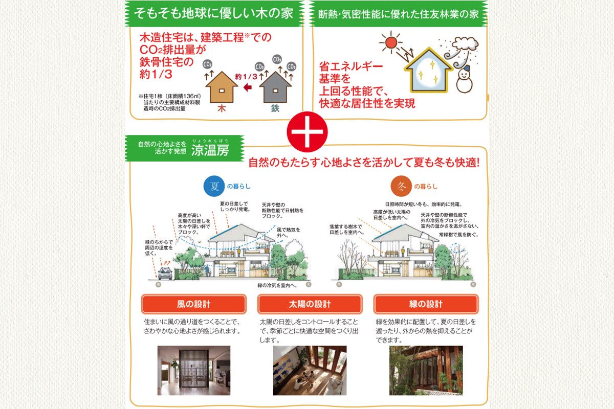 自然の力を活かした「涼温房」という考え方を基に住宅設計・建築をおこなう住友林業。軒の深い屋根や、明るい光を多く取り入れるための大開口、風通しを意識した窓の配置など、建築地の環境や立地を考慮した設計が魅力。