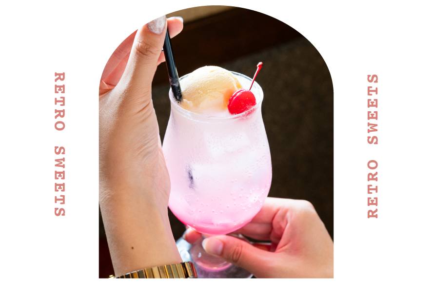 クリームソーダのラインナップはなんと、10種類!コーラや巨峰、パインなどカクテルなどにも使われる「captain」のシロップを使用。豊富なバリエーションとクオリティの高いこちらのシロップは色彩がはっきりと出て、ソーダとのグラデーションが美しい。10種類ある中でも、トロピカルピーチ味は見た目の可愛さだけでも十分癒されるが、アイスの濃厚な甘さとしゅわしゅわな炭酸の味わいにもまた、大満足でき、幸せな気持ちに。