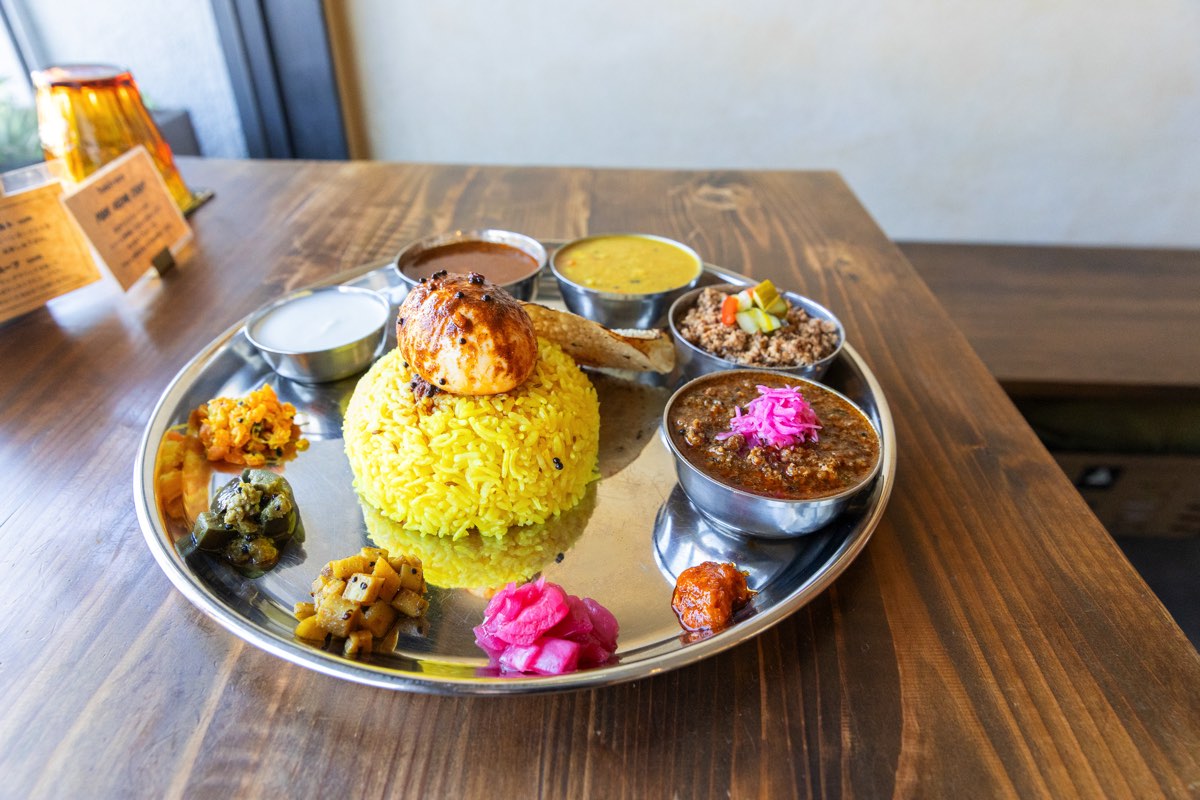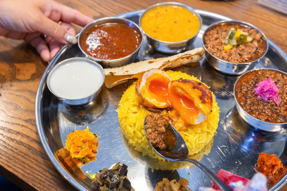 LIV SPICEのカレーは、まさに職人技が光るクラフトカレー!スパイスを塩と油と融合し、旨味を引き出し、シンプルながらその匙加減ひとつで、唯一無二の美味しさを作る。定番チキンキーマはシナモンの独特の甘やかな香りをネパール山椒が爽やかに。豆や県産野菜の優しいベジカレーは、ほかのカレーとも相性抜群!甘酸っぱいタマリンドペーストがクセになる酸味の本格ラサムや副菜、ヨーグルト、パパドを大胆にまぜまぜ、とろ~り半熟卵のスパイスオイル漬けと共に味わって。