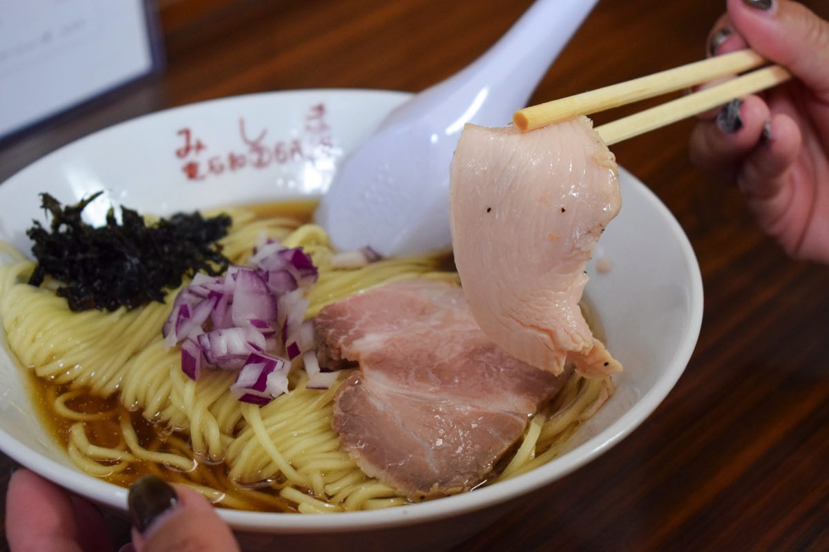 トッピングも鶏と豚の低温調理したチャーシューとばら海苔、紫玉ねぎというシンプルで上品な佇まい。