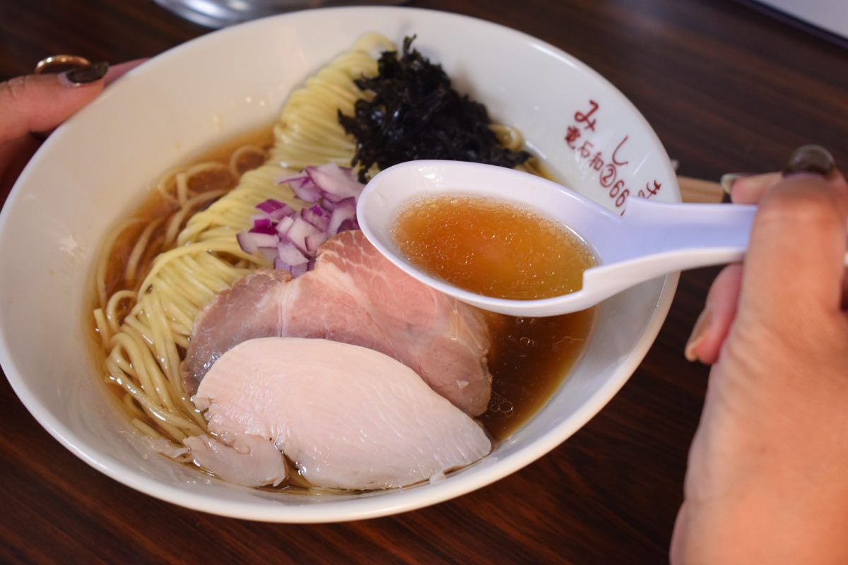 淡麗の透き通った煮干し醤油スープをひと口すすれば、あれ???これ何ラーメンでしたっけ!?…煮干しの概念を覆す、程よい塩味とまろやかな醤油、複雑で洗練された煮干しのアップグレードした風味とクリアな飲み口が舌を包む。