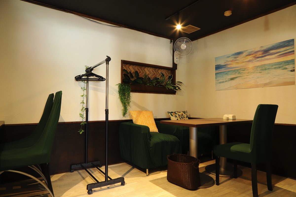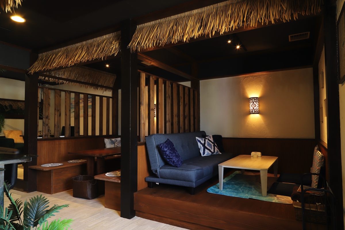 テーブル席やソファ席を配したくつろげる空間はそのままに、モダンシックな雰囲気から陽気なハワイアンムードに様変わり。