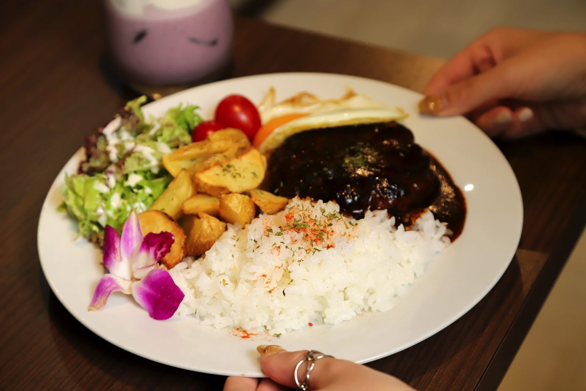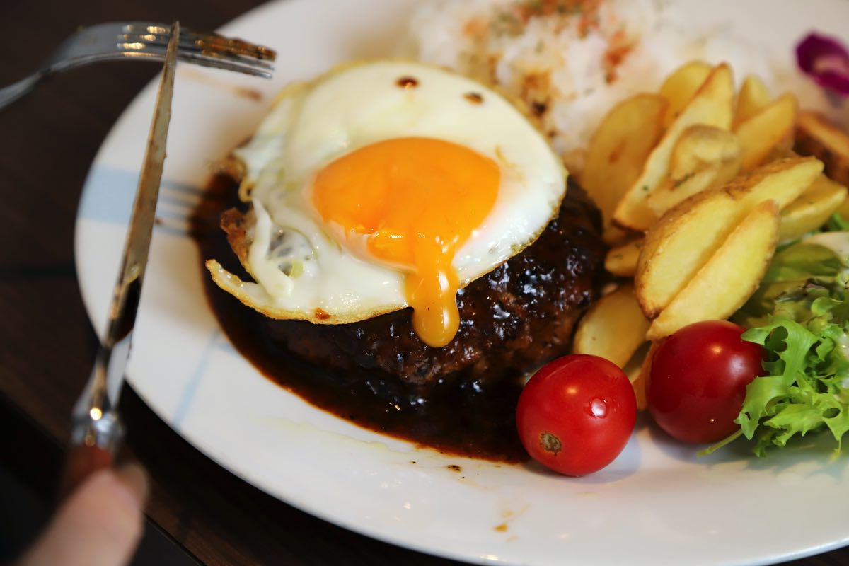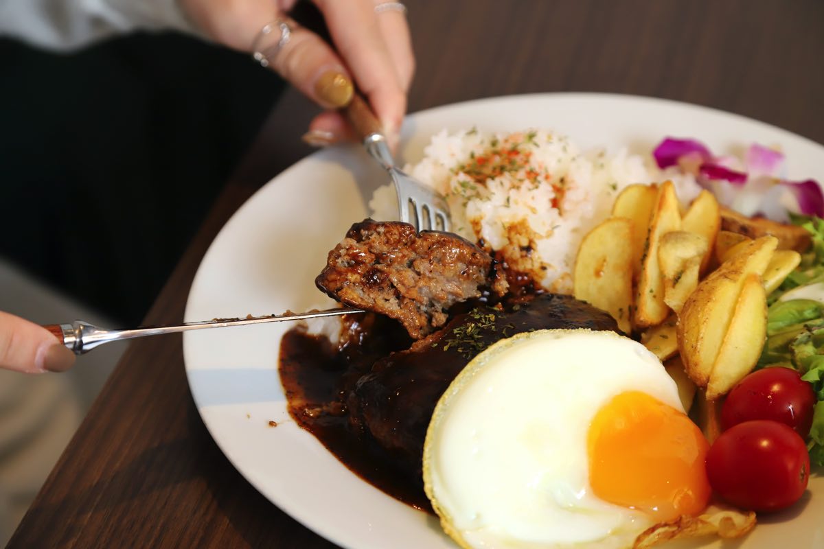 牛と豚の合挽を手ごねで焼いたハンバーグが、ボリューム満点で肉厚ジューシー!黄身が流れ出る目玉焼きと絡めて食べると、また贅沢な味わいに♡