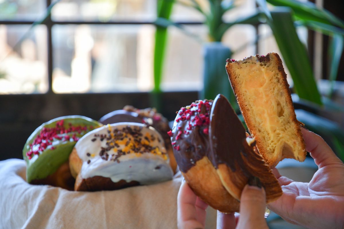 こちらもナント108層にも及ぶこだわりのデニッシュ生地に、自家製クリームをたっぷりと。定番のミルク、チョコレート、シーズナルの塩キャラメルの3種類がラインナップする。