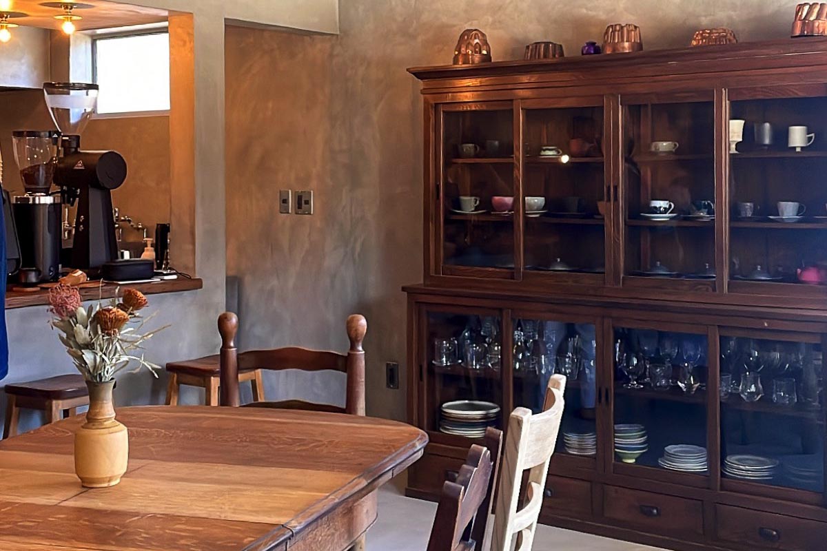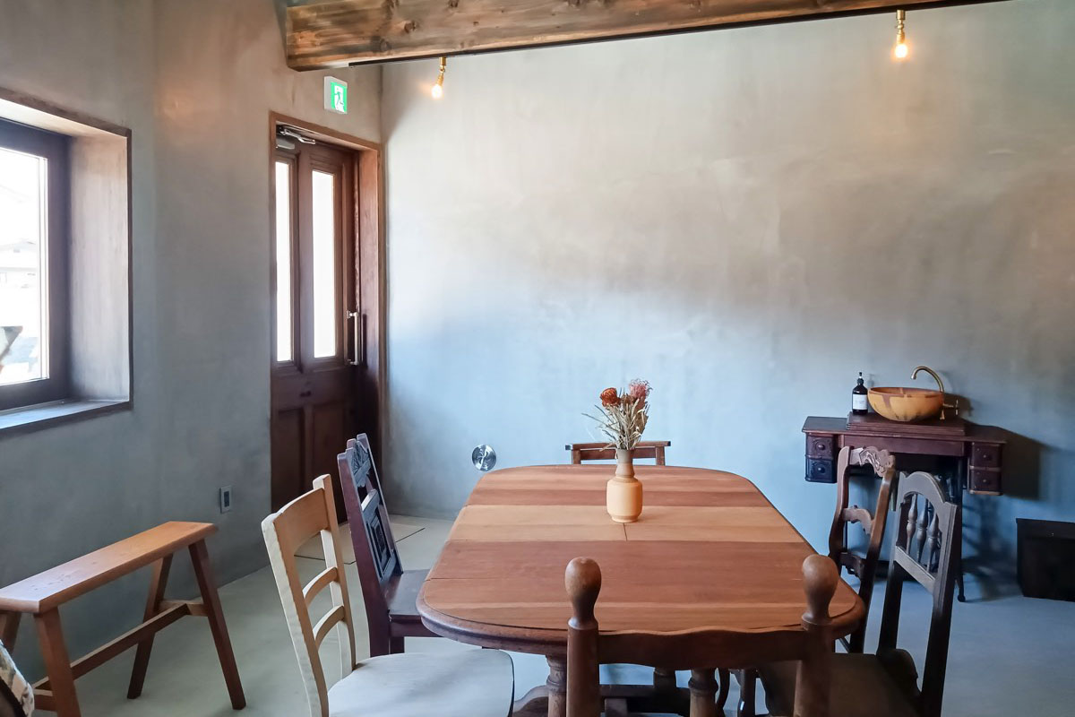 モルタルのスタイリッシュな雰囲気を醸しながらも、どこかほっとする温かみに溢れているのは、県産材などを使い丁寧に手作りされた家具や「古い物を大切に受け継いでいく」ことをコンセプトにしたアンティークのせいかもしれない。