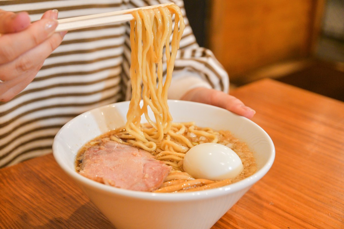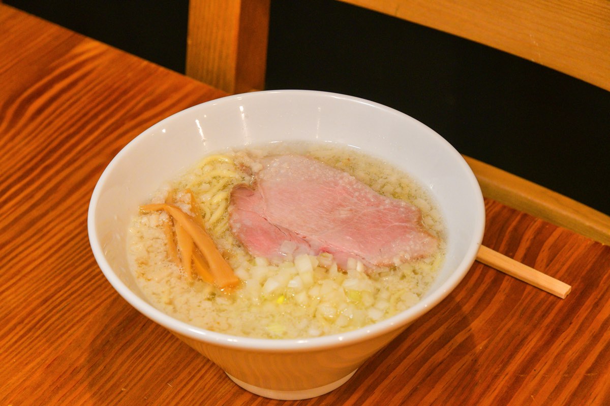 まずはスープから。見た目からは想像できないほどあっさり!豚のげんこつを長時間煮込んだスープに関西の醤油をブレンドし、背脂とバランスよく、スープはあっさりと仕上げているんだとか。トッピングの玉ねぎがいいアクセントに。