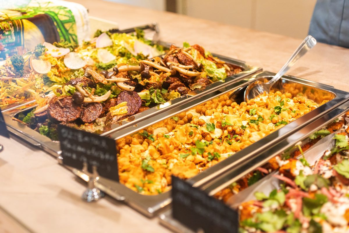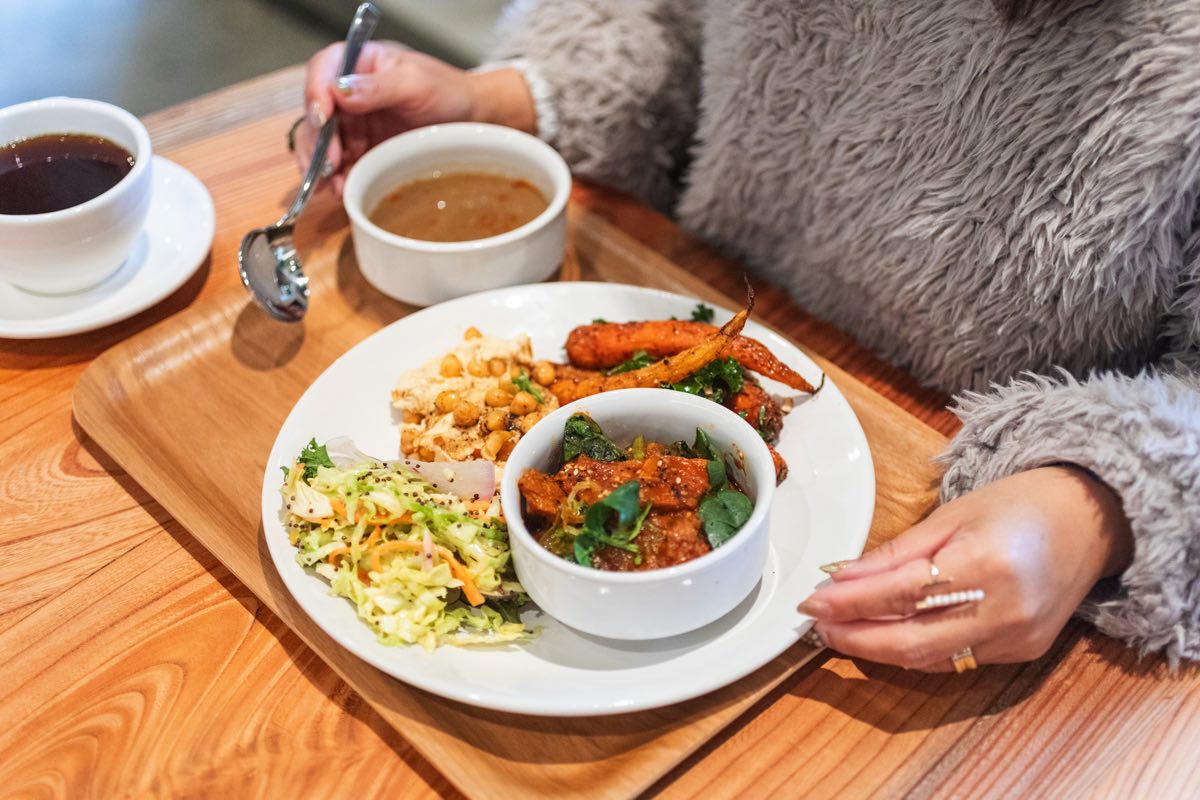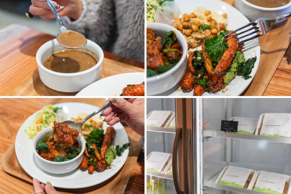 大豆ミートのメインデリの中から、私は「白菜のバハラットシチュー」をセレクト。サラダデリはサボイキャベツと紅心大根の柚子ドレッシングスロー・ひよこ豆のフムス・ベビー人参とルッコラ アーモンドのザクロソースの3種類を。