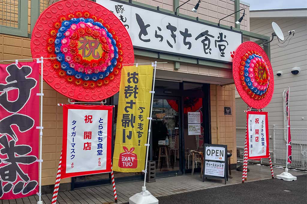中央市「若宮」の交差点のところのテナントの一角に、豚もつ煮定食専門店「とらきち食堂」が2024年2月23日オープン!「豚もつ煮定食」1本で勝負する専門店ということで、これは期待度が高まる。