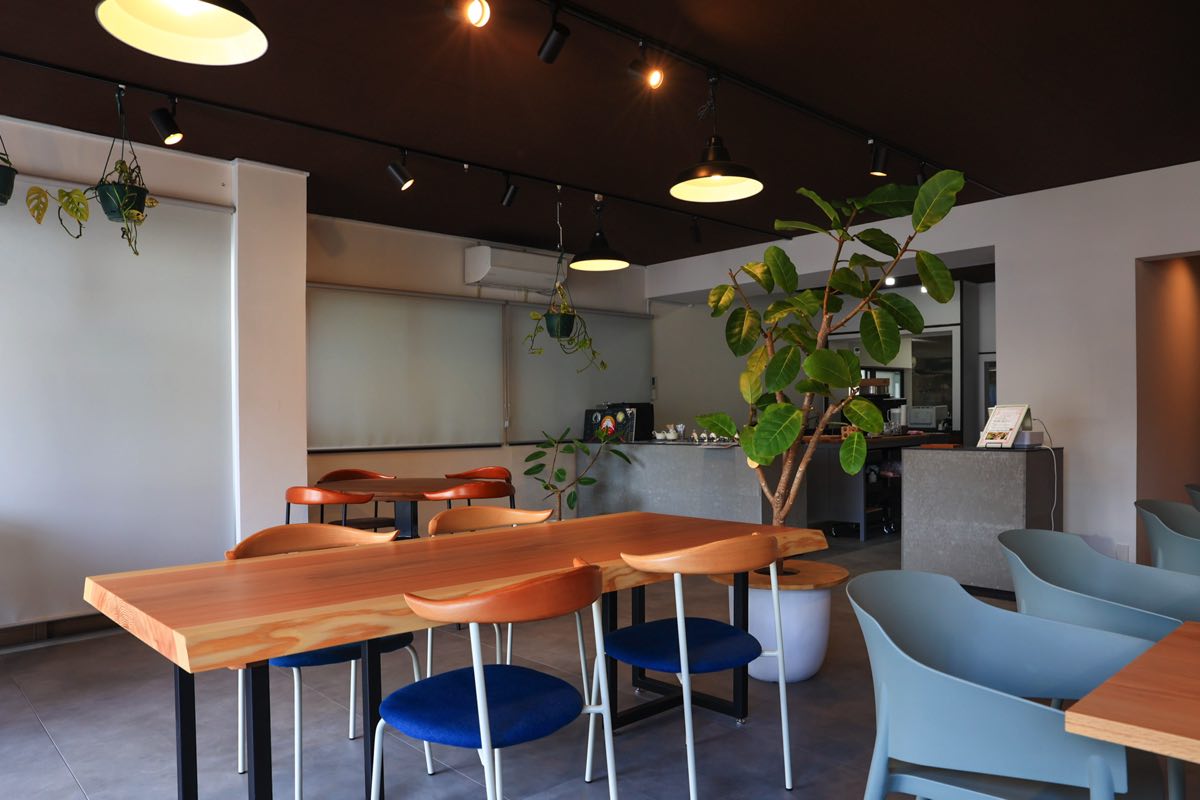 開放感溢れる店内は各テーブルごとの間隔が広めなので、ゆったりとくつろげそう。湖を眺めながらくつろげるカウンター席も気持ちいい。