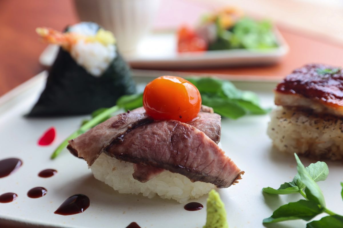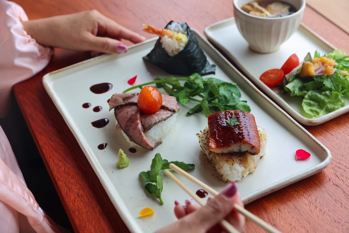 甲州ワインビーフのローストビーフのおむすび、うなぎの焼きおにぎり、天むすの3種類のおむすびに、サラダとお味噌汁が付く。彩りも美しく、ちょっとリッチな朝ごはんにテンションも上がる。