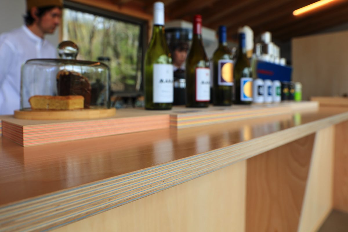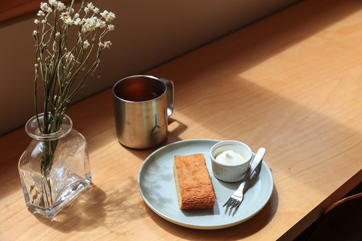 よく見るとお菓子の台座やカウンターにも美しい断面が…。これは色再生紙と北海道産の木材を貼り合わせたプロダクツなんだとか。また、自家製コンポストで生ごみを肥料に変えたり、今はみつばちの巣箱を製作中と、「Sustainability」にも取り組んでいる。