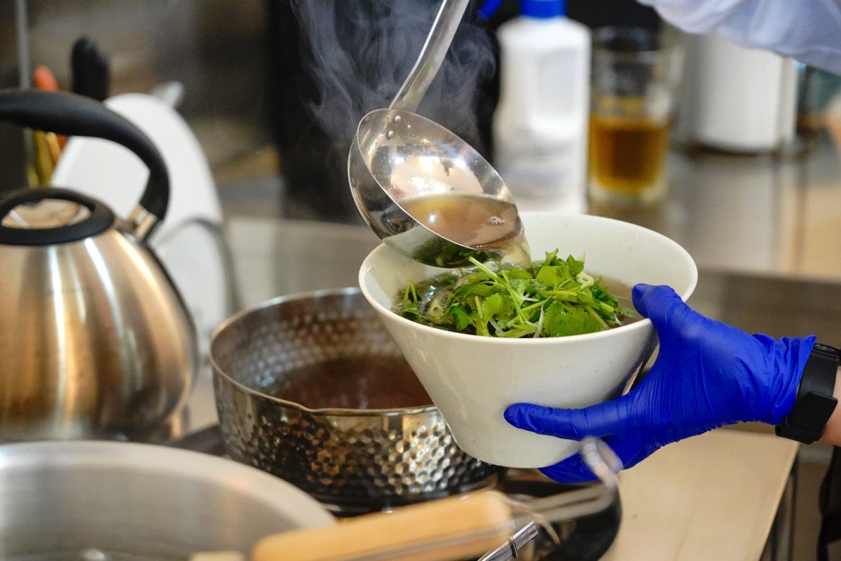 透明度が高く、それぞれの食材の旨味を最大限に美味しくいただく工夫が詰まったスープに、タピオカ粉入りのつるつるもちもち麺が口当たりよく、するすると食べ進められる。約9種類のスパイスをブレンドし煮込んだ牛すねは美しい筋が通り、風味や旨味が驚くほど濃厚で、ほろほろやわらか~。
