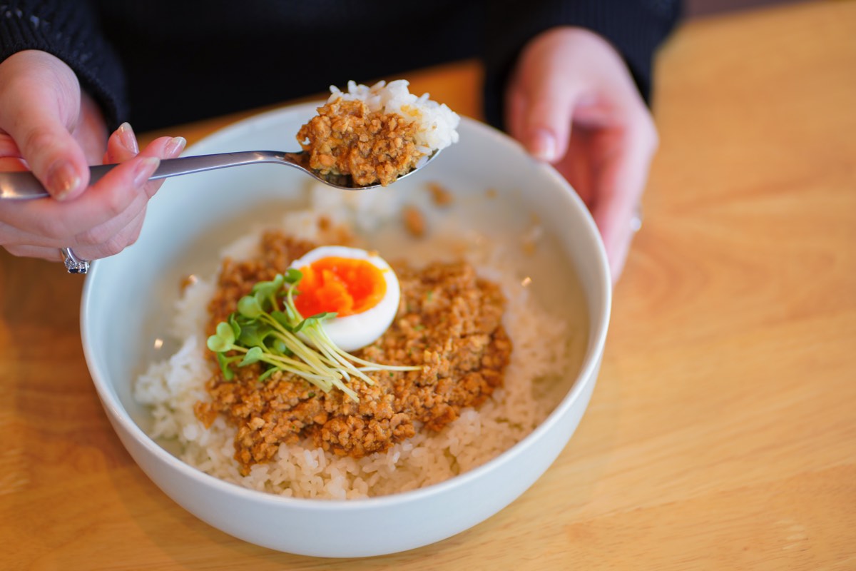 ひと口食べてその味わいに驚く。カレーの味はするけど強いスパイス感もなく、醤油と生姜の和風な味が効いて新感覚!その秘密は、何種類かのスパイスを調合したカレー粉に、山口県で有名な「河村醤油」のだし醤油と生姜をいれ、和風に仕上げているんだとか。辛味もなくグルテンフリーなので、子どもやスパイスが苦手な人でも食べやすい。上にあしらった半熟卵は山梨県産で、トロっと流れる黄身がまろやかさをプラスして相性抜群。