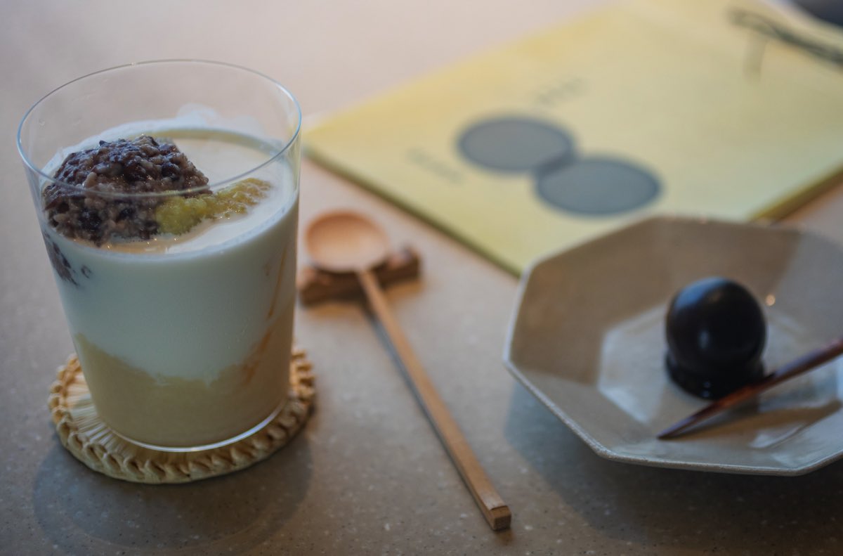 「発酵あんこ」は小豆と米糀を使用し、発酵の力だけでどこまで甘みを引き出せるのか試行錯誤を繰り返し完成した渾身の逸品。五味醤油の米糀だけで作った甘酒をヨーグルトで割り、発酵あんこをアイスのように浮かべる。まずは発酵あんこだけを味わう。