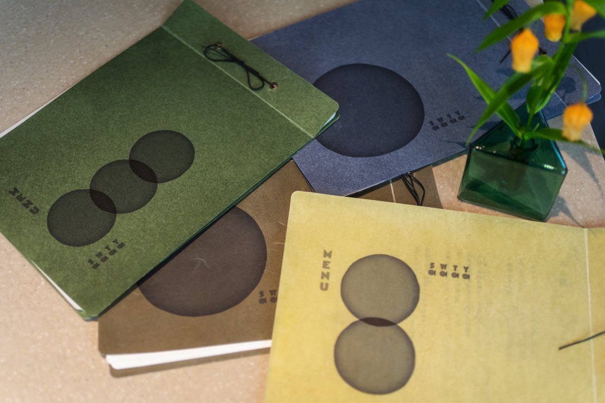 各テーブルに置いてあるメニュー表はひとつひとつ蝋引きを施し、手作業でハトメし、ひもを通して結んだという。市川大門の和紙を使った独特の厚みと手触りにぽっと気持ちが温かくなる。