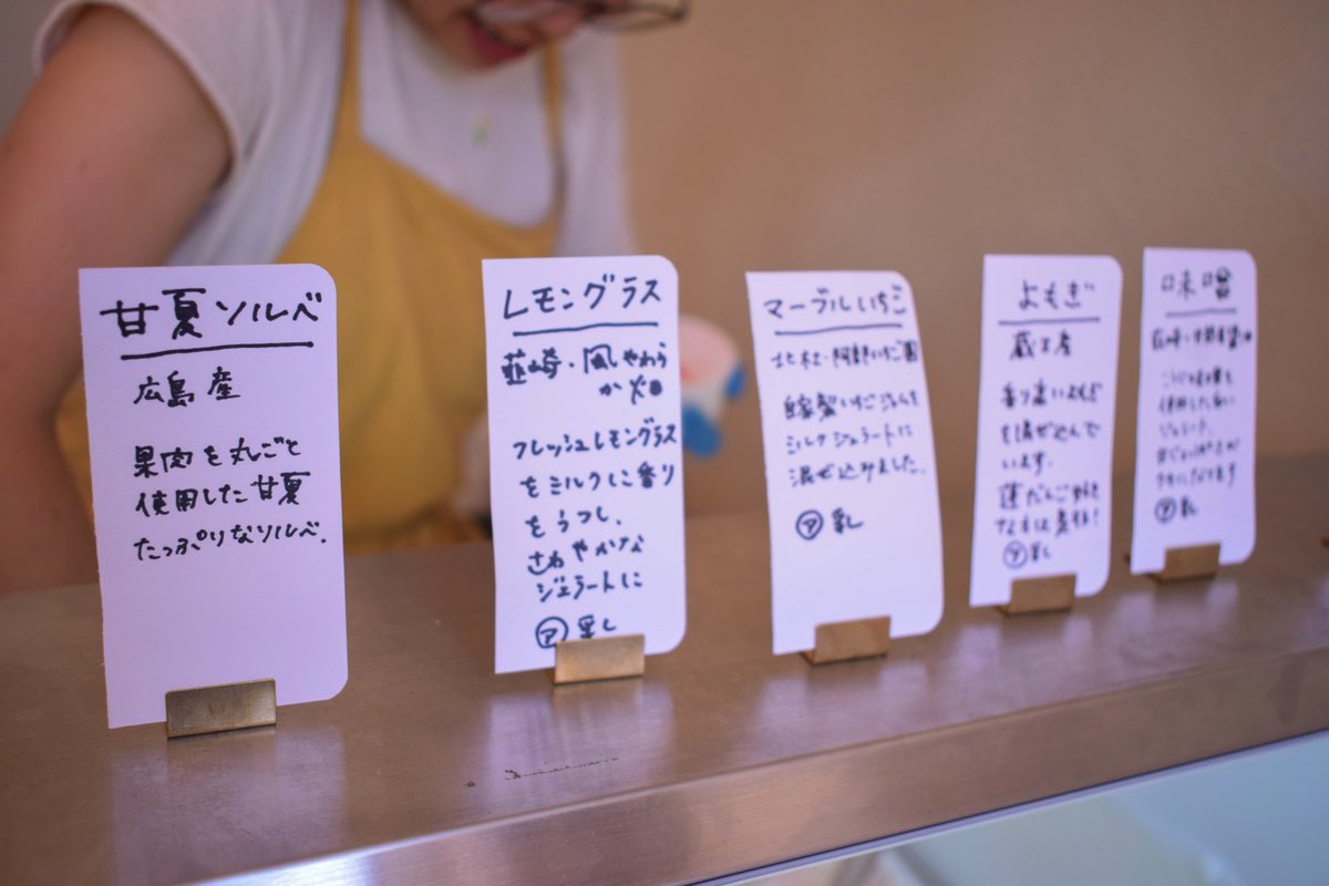 | 主な メニュー | ・シングル 540円 ・ダブル 590円 ・トリプル 640円 ・キッズ 300円※小学生以下 <取材時のラインナップ> ・ジャージーミルク ・味噌 ・よもぎ ・マーブルいちご ・レモングラス ・甘夏ソルベ |