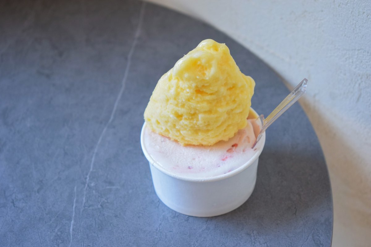 カメラマンNは、果肉を丸ごと使ったさっぱり「甘夏ソルベ」と北杜市「阿部いちご農園」のいちごで作る自家製ジャムをミルクジェラートに混ぜた「マーブルいちご」をチョイス。素材の良いフルーツを使っているので、そのままの旨味がふんだんに味わえちゃう。