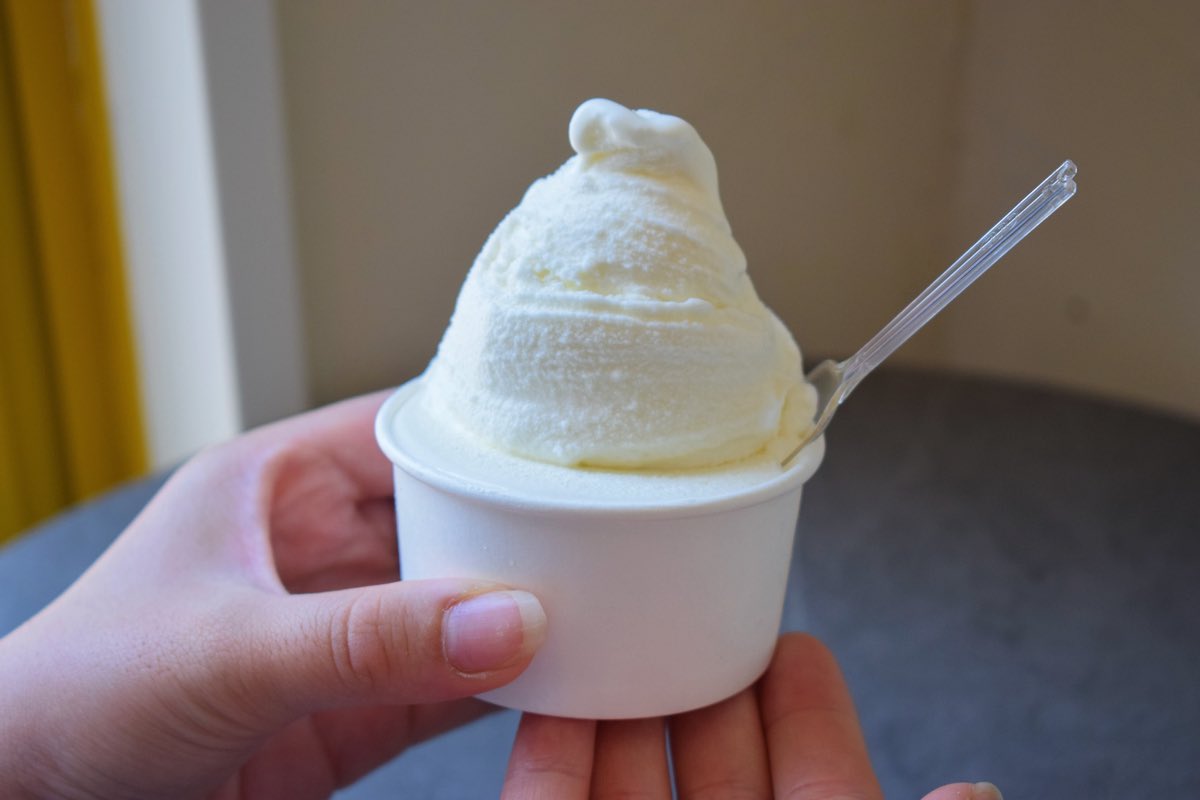 上の「味噌」は、お隣「井筒屋醤油」の甘みたっぷりの麹味噌を使用。元々白っぽい麹味噌にさらにミルクベースと合わせて作っているので、味噌とは思えないくらい真っ白!