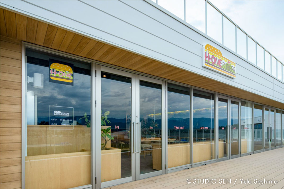 「H-ONE BURGER」は、山梨県の食材にこだわり、人もワンちゃんも楽しめるハンバーガー屋さん。店内でのイートインはもちろん、展望テラスや芝生広場などでテイクアウトするのもおすすめだ。
