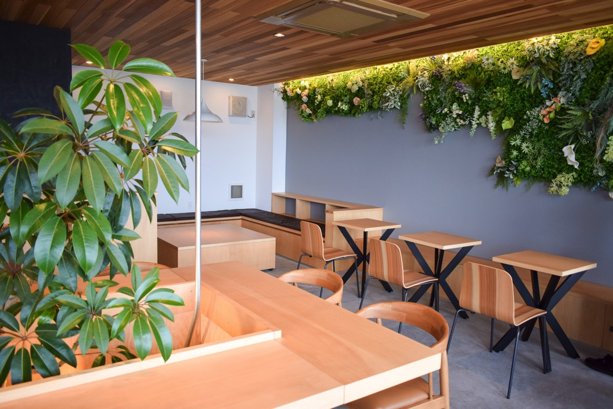 緑溢れる開放的な店内は、フォトジェニックなセンターテーブルを中心に、景色を見ながらくつろげるカウンター席や8人掛けのボックスシートなど、バラエティに富んだ席を配す。注文は券売機でテイクアウトかイートインか選び、セルフオーダーするシステム。