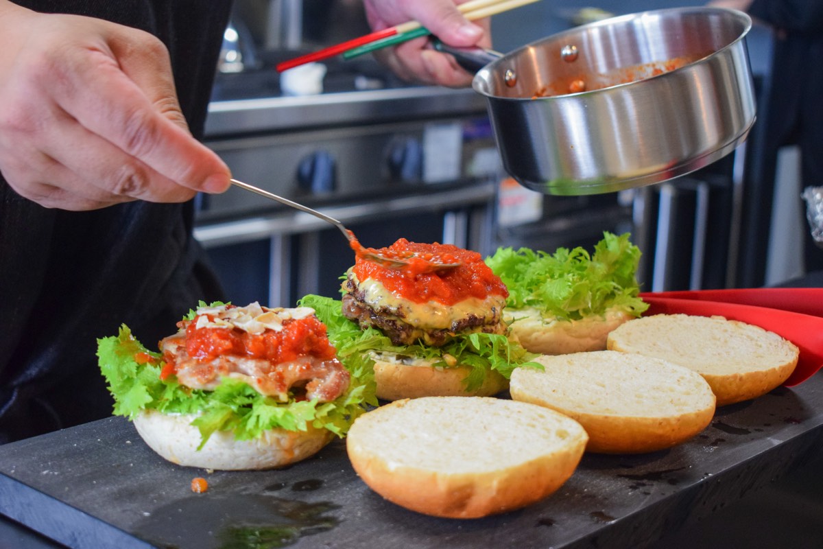 甲州ワインビーフ100%のダイナミックなWチーズバーガーや信玄鶏のガーリックトマトバーガーなど、約10種類が揃うハンバーガーは、魅力的なラインナップでお目見えする。