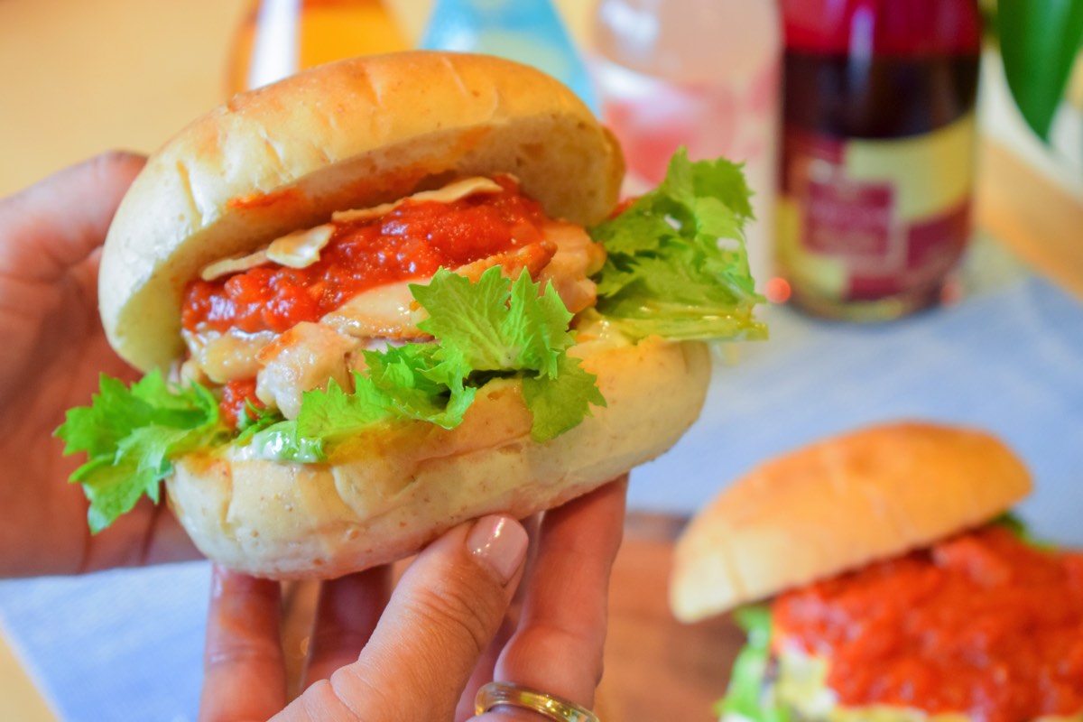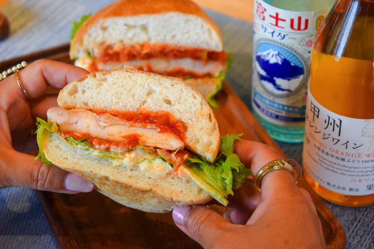 中でもイチオシは信玄鶏のガーリックトマトバーガー!ニンニクがきいた玉ねぎたっぷりのサルサソースがよき。しっとりと旨味溢れる信玄鶏に、爽やかな辛みのわさび菜がさっぱりと◎。