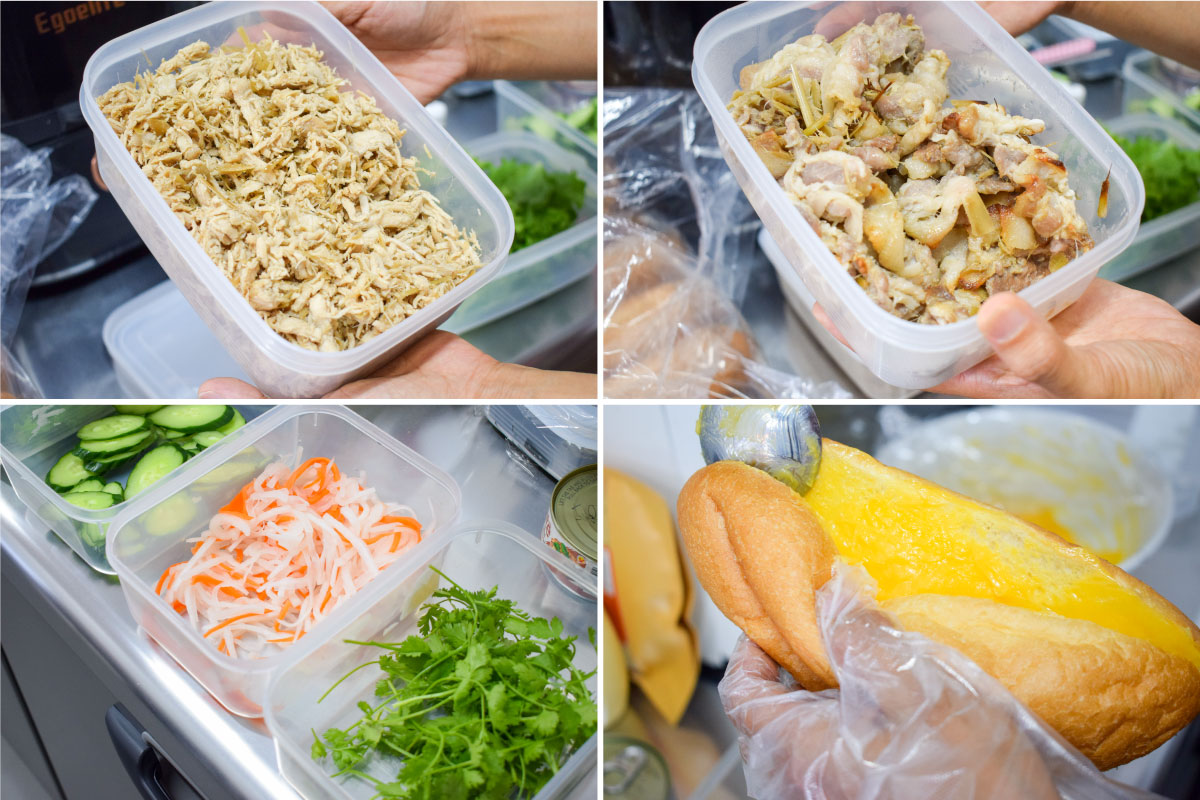 レモングラスとニンニク、塩で下味をつけた豚肉は焼肉バインミーに、レモングラスでじっくり煮込み、しっとりジューシーに仕上げた鶏むね肉はレモングラスチキンバインミーに。さらにパクチーや甘酸っぱいなますなどをサンドし、4種類のバインミーが完成する。具材をたっぷり挟むことを前提にしたバインミー専用のベトナムパンは、ちょっと甘めの特製たまごソースをたっぷり塗って。