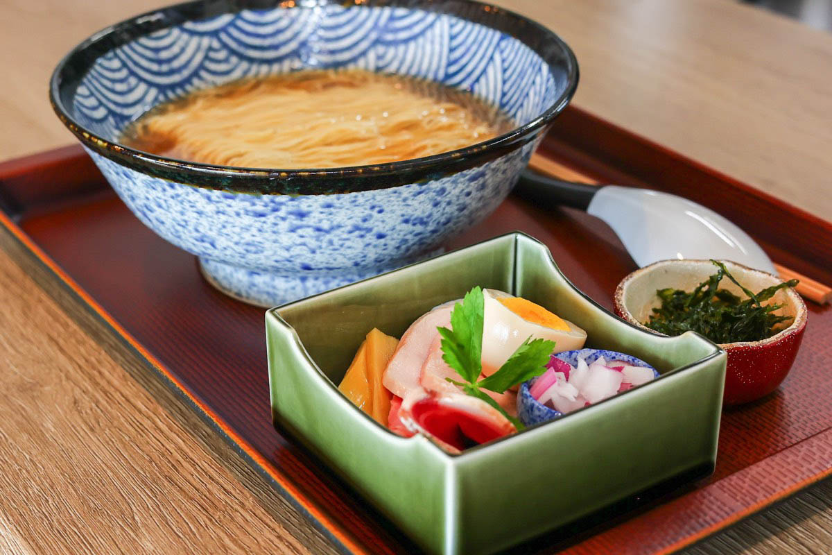 見よ!これぞ、和食屋さんが生み出す渾身のラーメン!トッピングはあえてのせずに別皿で、和の一品料理のように提供するのが「麺あかざわ」の流儀。麺の上にのせてしまうと、どうしてもその味がスープにうつり、濁ってしまうからと、まずは素のスープの味をじっくり味わうべし。
