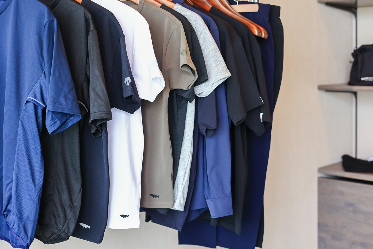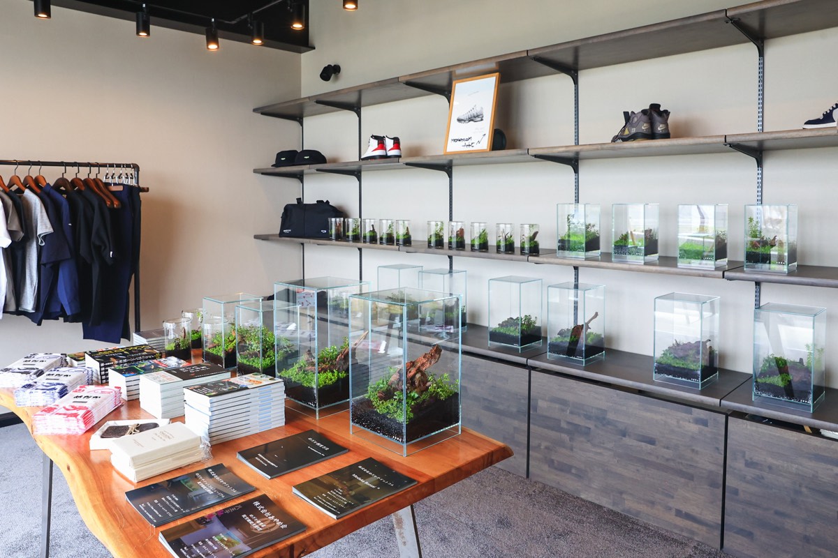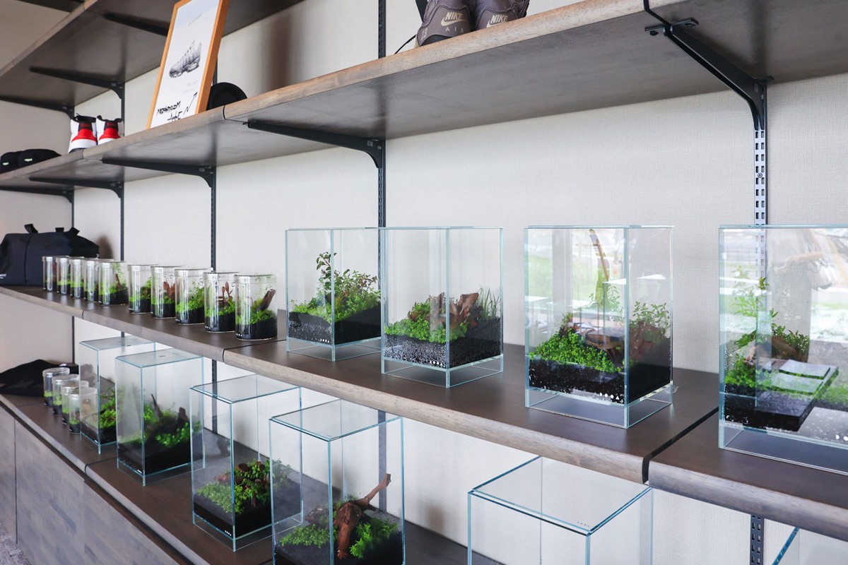 店内には美しいアクアリウム「めだか盆栽」がズラリと並んでいて、なんだか癒される~!様々なタイプのめだか盆栽のほか、DESCENTE別注のオリジナルTシャツやグッズの販売も。