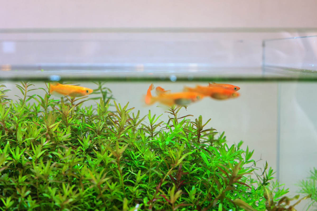 におわない・濁らない水槽で、水替えもなし!ガラス水槽の中で、水草を使って表現する盆栽がこの「めだか盆栽」。バクテリアを使った肥沃な土壌と、めだかの特製を踏まえた空間をつくり、疑似的に水槽の中に自然界の循環のしくみを再現したというわけ。