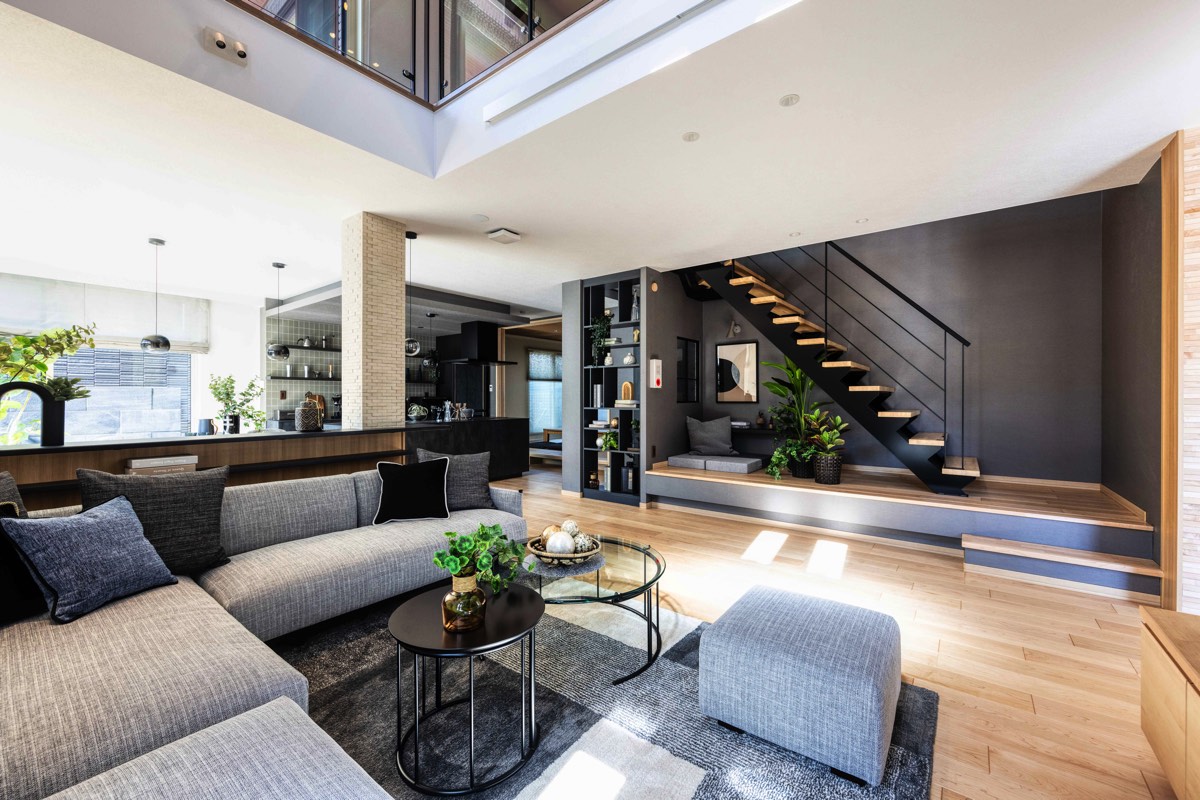 見上げるような吹抜けのリビングは窓面積を抑えることで包み込まれる安心感を演出。家族や訪れた方が集い、くつろぎたくなる居心地の良い居場所がおうち時間を充実させます。