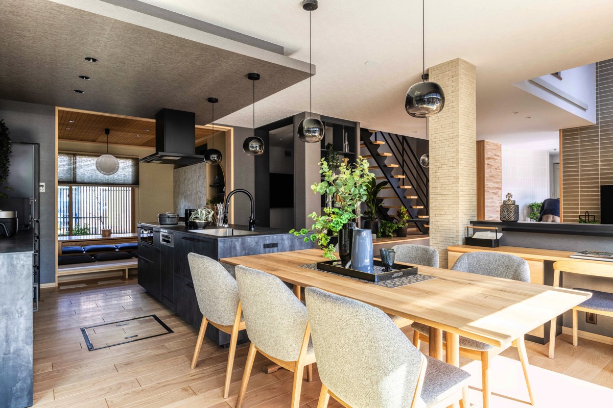 リビングを見渡せる黒を基調としたキッチンと大開口に面したダイニングは、家族が食事を楽しめる明るく気持ちの良い空間を演出しております。
