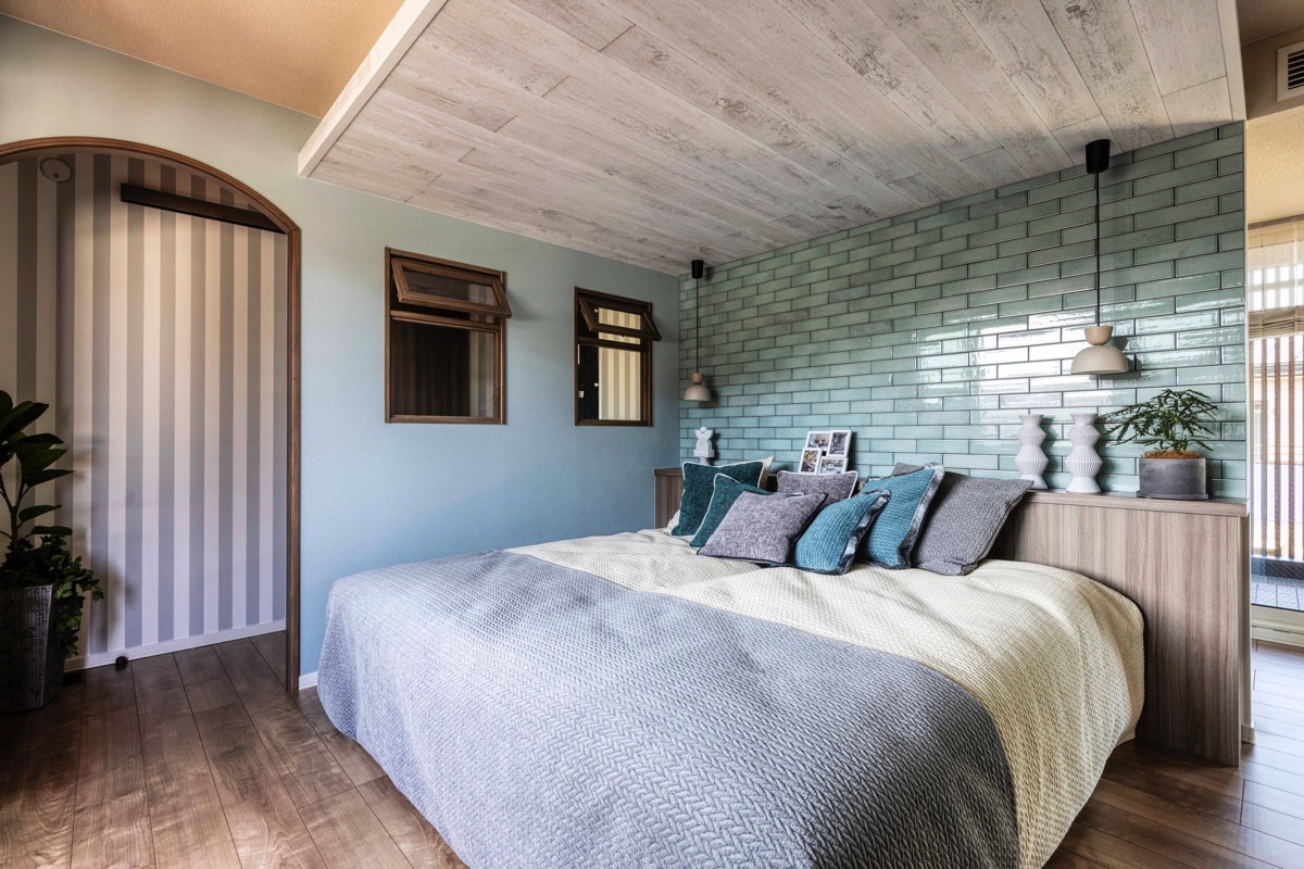 ペンダント照明が柔らかな光を放ち、ヘッドボードの素材感は豊かなタイルは、日々の喧噪から解放され穏やかな空間を演出しております。