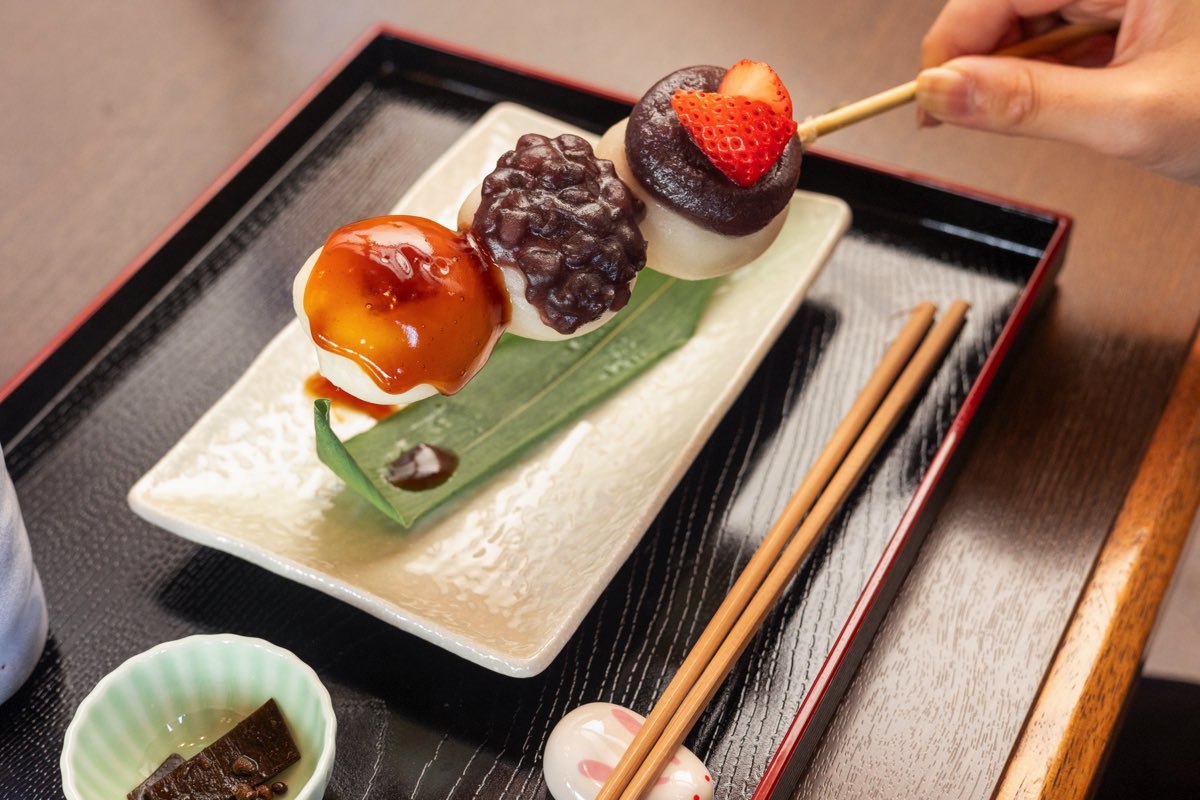 地元の製餡所でお団子に合うように作られたつぶあん、こしあん、そしてみたらしの3種類が1つで味わえちゃうのも嬉しい。こしあんには県産いちごも乗っており、甘酸っぱさがアクセントに。テイクアウトもできるので、山中湖に行ったらぜひ立ち寄ってみて。