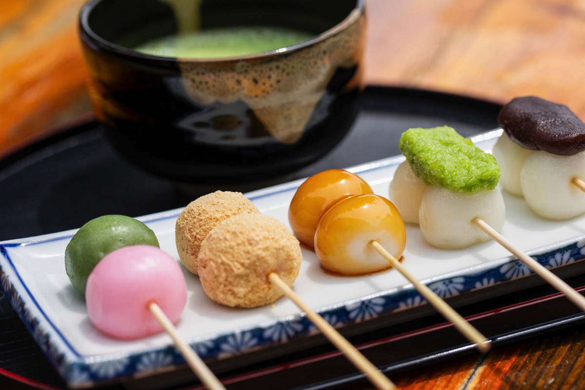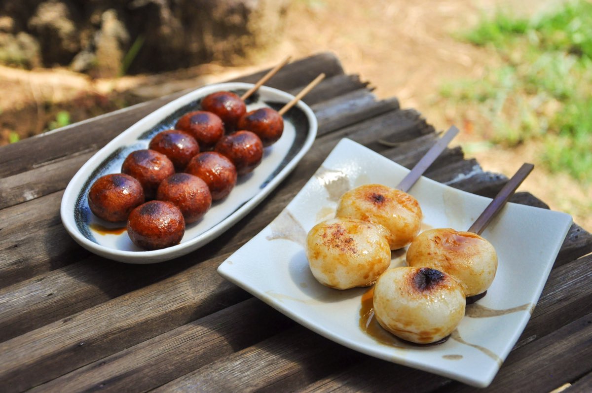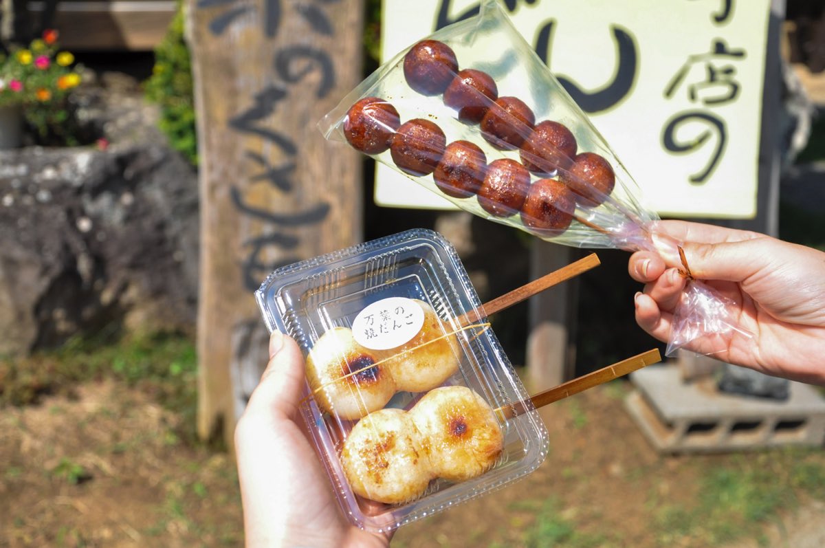 茅葺屋根の家を復元し、美しい日本の原風景に出会える「西湖いやしの里根場」。その中にある茶屋のお座敷や縁側でのんびりお団子を頬張って。みたらしやずんだ、あんこなどの色鮮やかなひと口サイズのお団子は、見た目も可愛くてほっこり~。