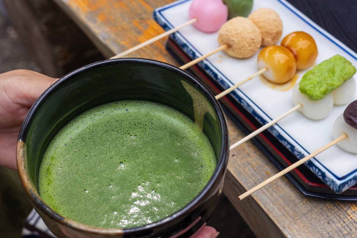 彩り団子はお抹茶付きで、富士吉田の抹茶屋さんのお茶を注文を受けてから1杯1杯丁寧に点ててくれる。静かな緑の中で、ふんわりと香る抹茶の香りとともに、もちもち食感のお団子を楽しもう。