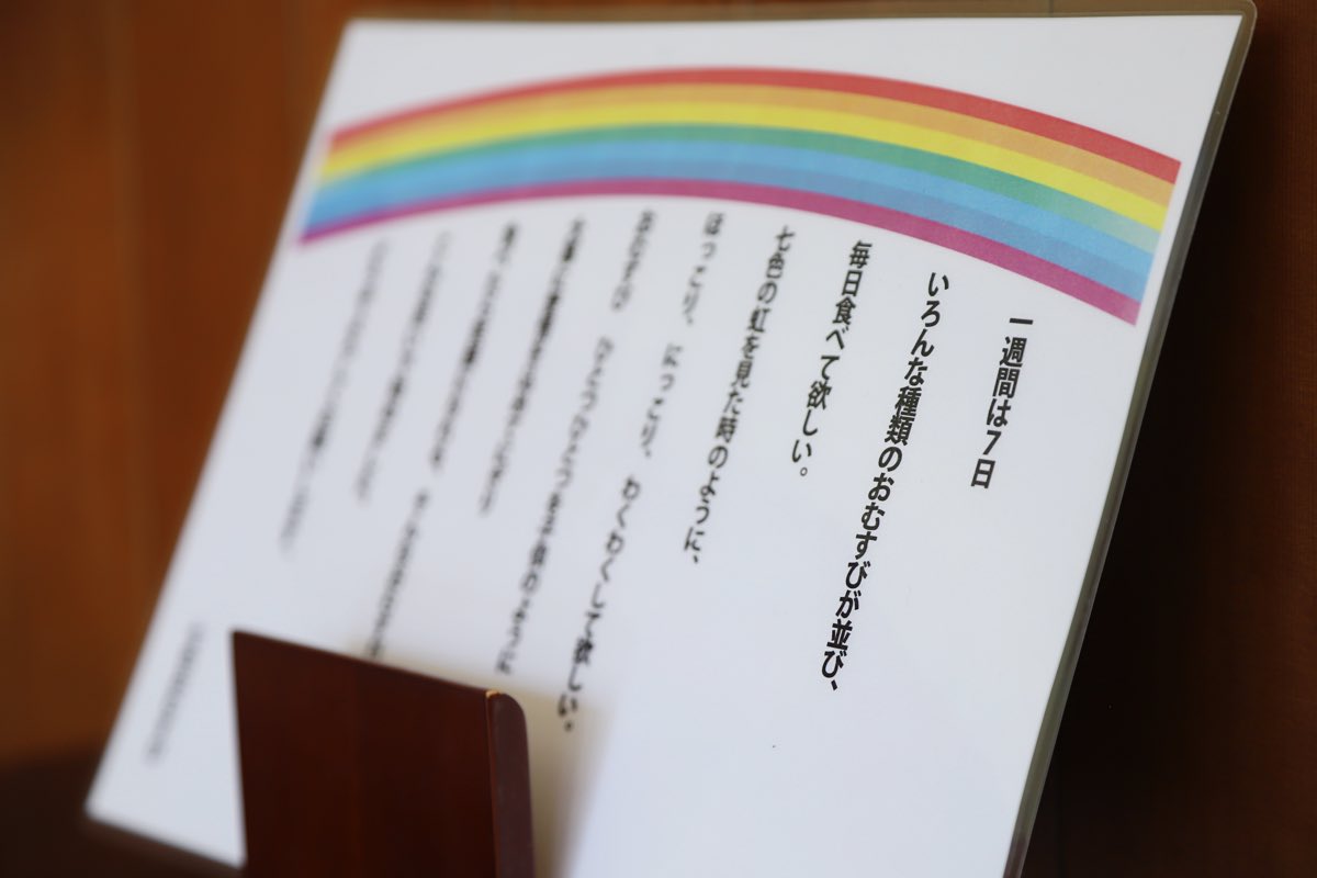 「一週間は7日。いろんな種類のおむすびを毎日食べて、七色の虹を見た時のように、ほっこり、にっこり、わくわくしてほしい」。