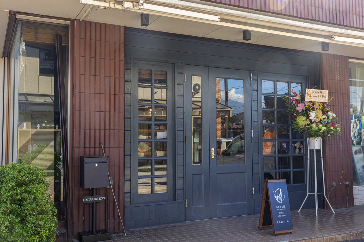 富士吉田市に2024年9月1日オープンした「おむすび屋 坤(こん)」は、くすみブルーのドアがまるでパティスリーのようなおしゃれな佇まいのおむすび専門店。