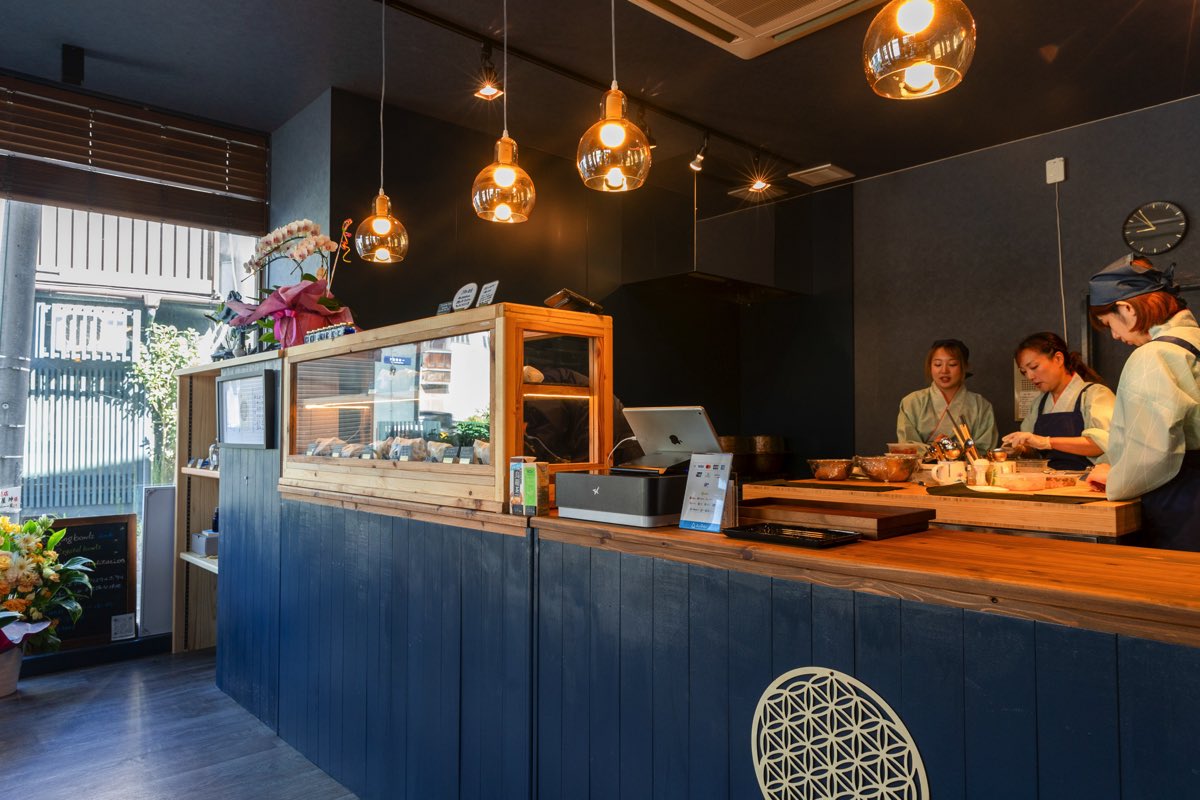 活気溢れるオープンキッチンでは、せっせとおむすびを握る姿が。ショーケースには約10種類の無添加おむすびがズラリと並ぶ。テイクアウトをメインに、カウンター席も4席備え、イートインもOK。