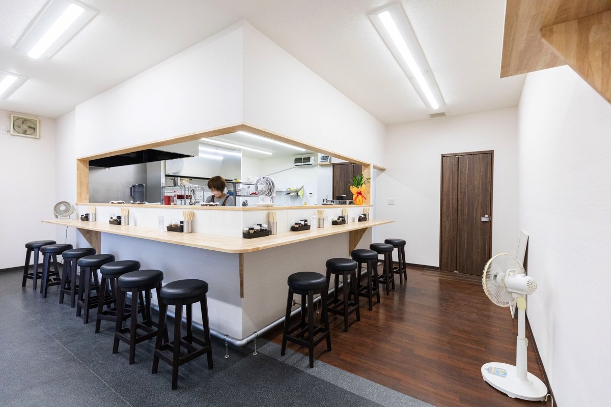 L字型にカウンター席が12席配された、白を基調にした清潔感溢れる店内は思ったよりゆったり。スタッフに口頭で注文し、料金は後払いするシステム。