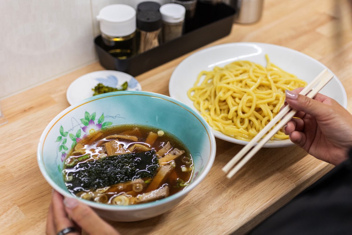 もちっとコシのある太麺をつけダレへダイブ!つるりとのど越しがよく、鶏ガラベースのあっさりとした醤油スープとともにすする。酸味がガツンとあるのも、一福ならではの美味しさだ。