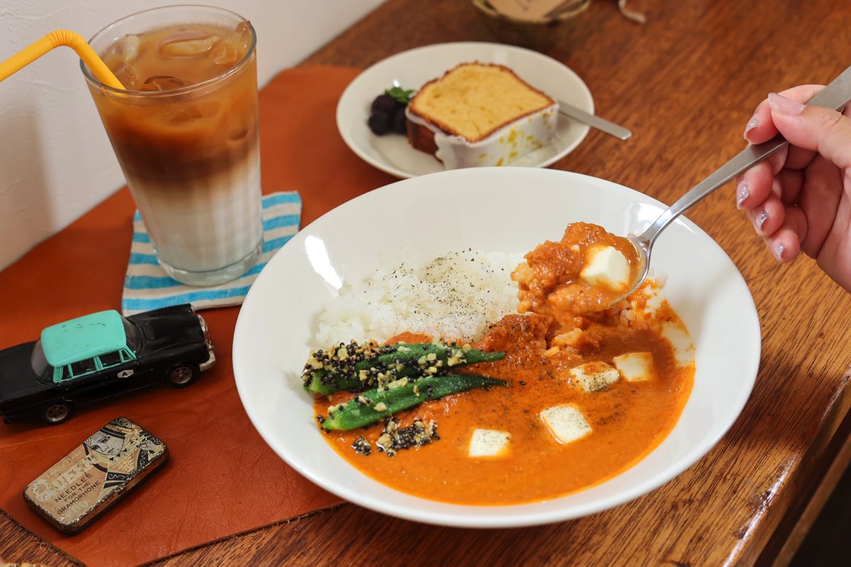 ランチにはバターチーズカレーを。トマトをたっぷり入れ、しっかり炒めて酸味より甘みを引き出す。ニンジンやカシューナッツもミキサーにかけ、モッツァレラチーズでさらに味わいに深みをプラス。